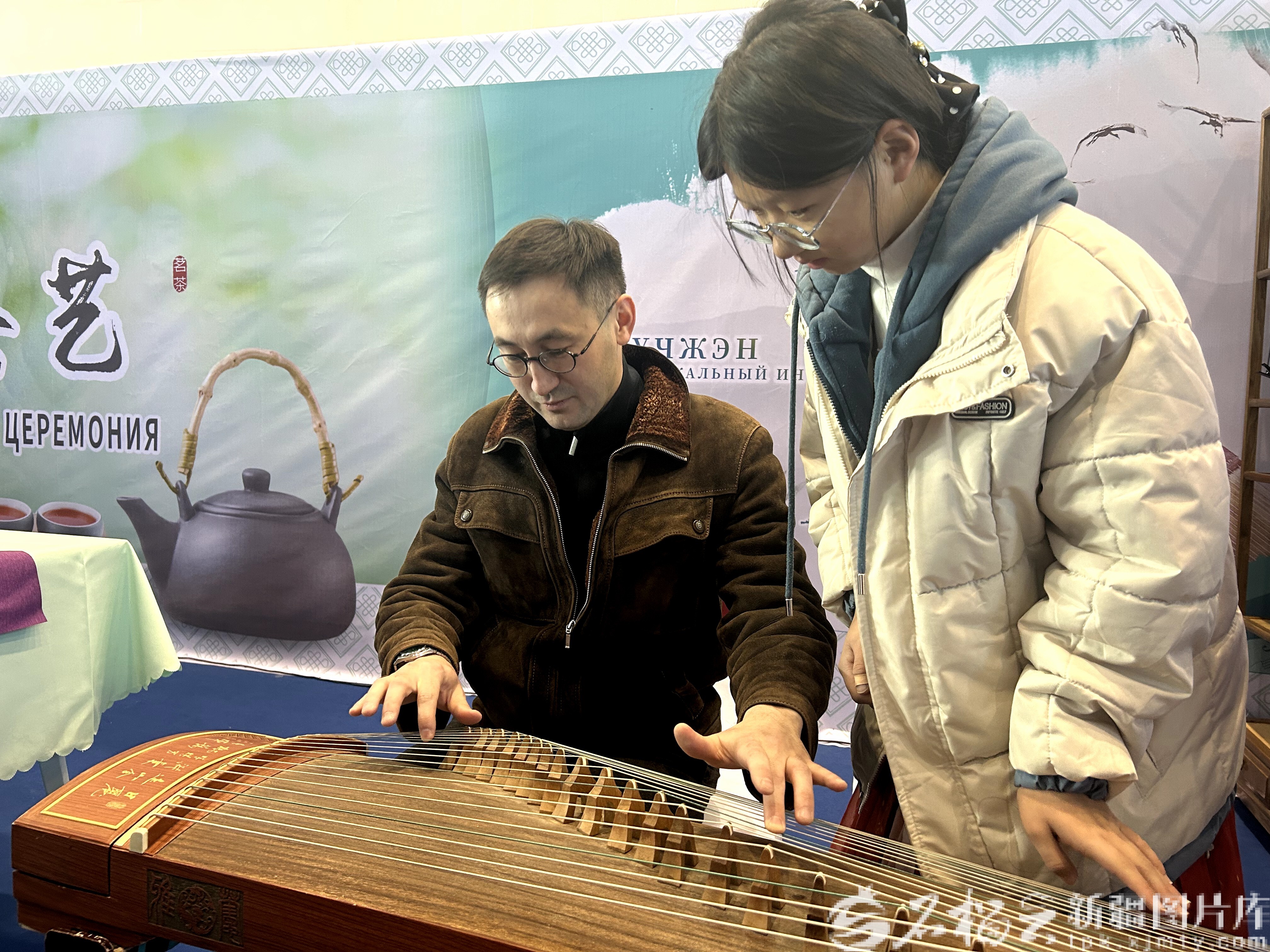 哈薩克斯坦青年學(xué)習(xí)彈奏古箏。