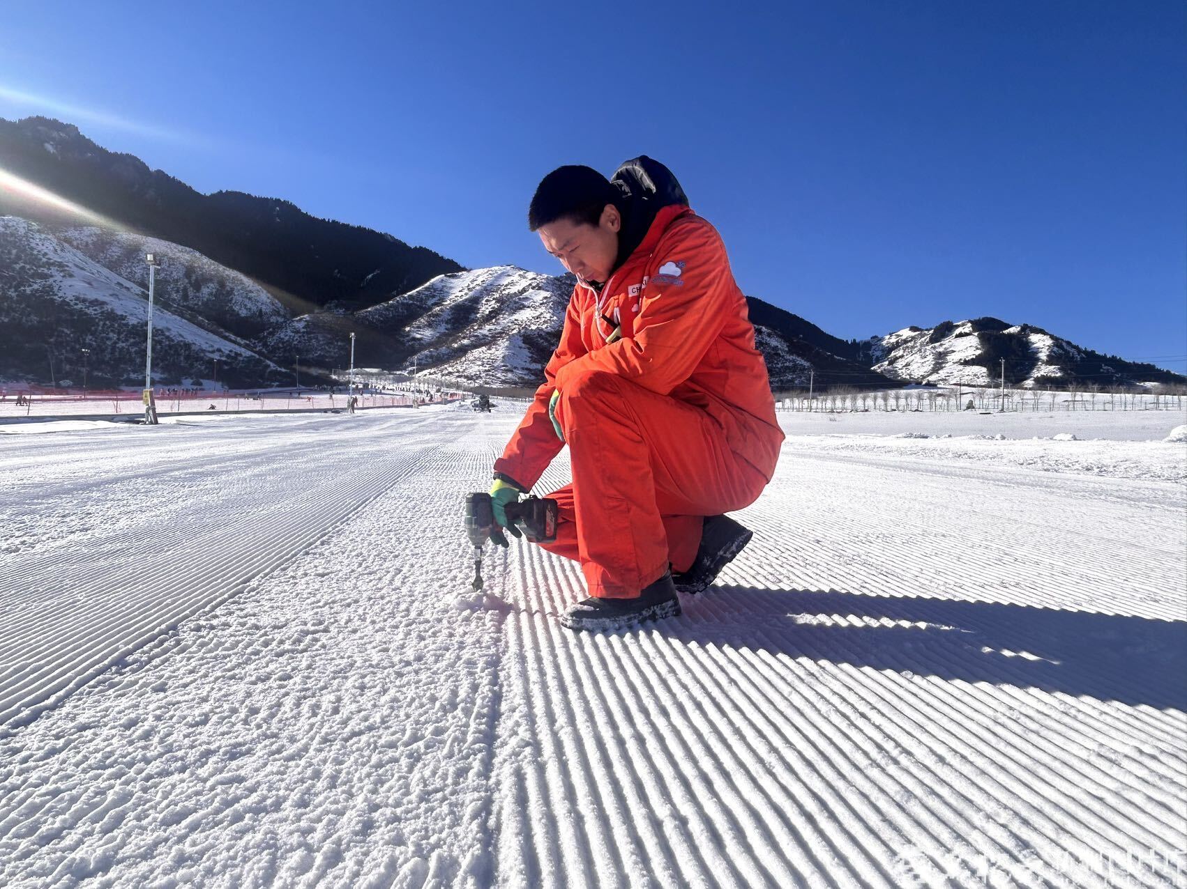 11時,陽光灑在雪道上,各色滑雪服的身影交織流動,歡聲笑語在冷冽的空氣中格外清脆。另一邊還未開放的雪道上,一抹橙色的身影格外醒目。壓雪機早晨剛壓過的雪道上,是雪友們喜歡的“面條雪”,李彥周拿著雪鉆在不同的位置探入雪道測試積雪厚度,30厘米左右的厚度是開放的硬標準?!斑@條初級教學(xué)道也達到標準,剛好趕上放雪假的娃娃們來滑。”李彥周說。