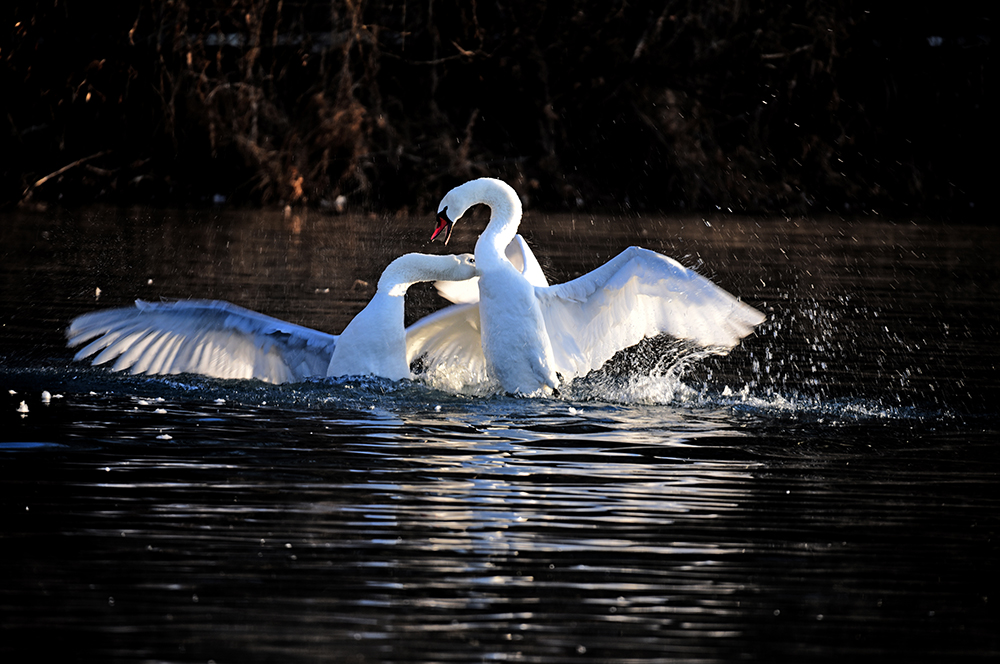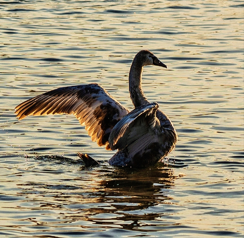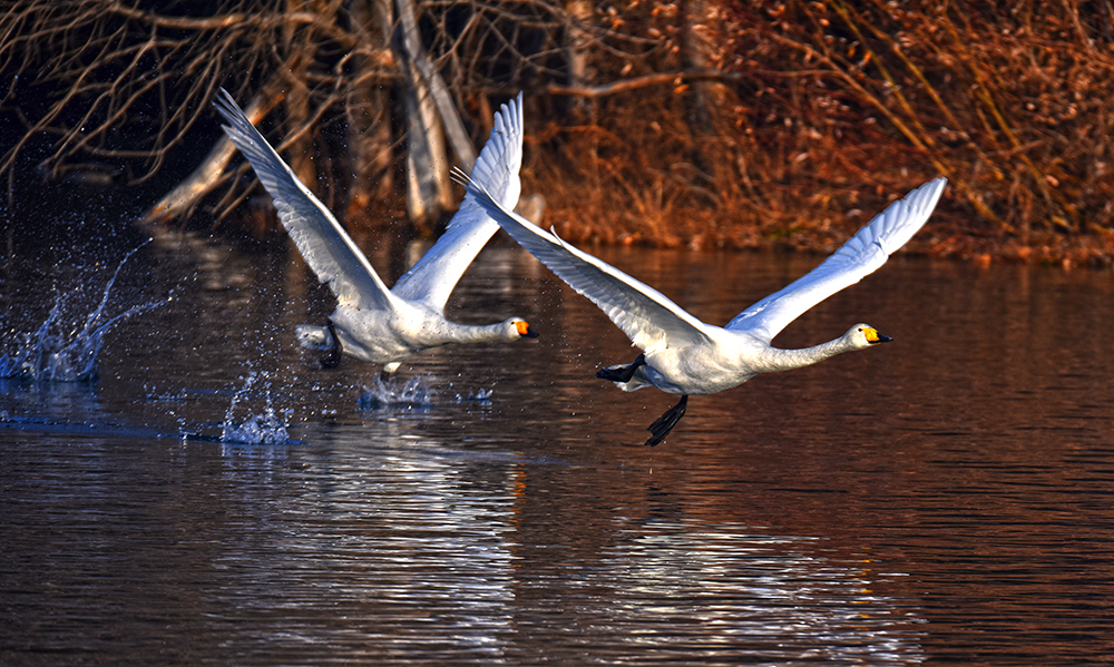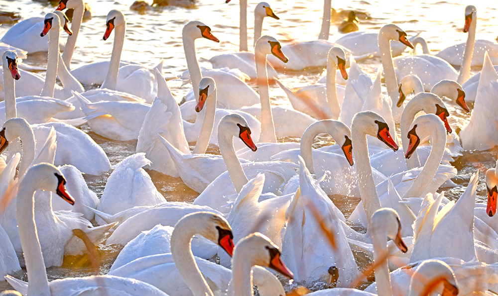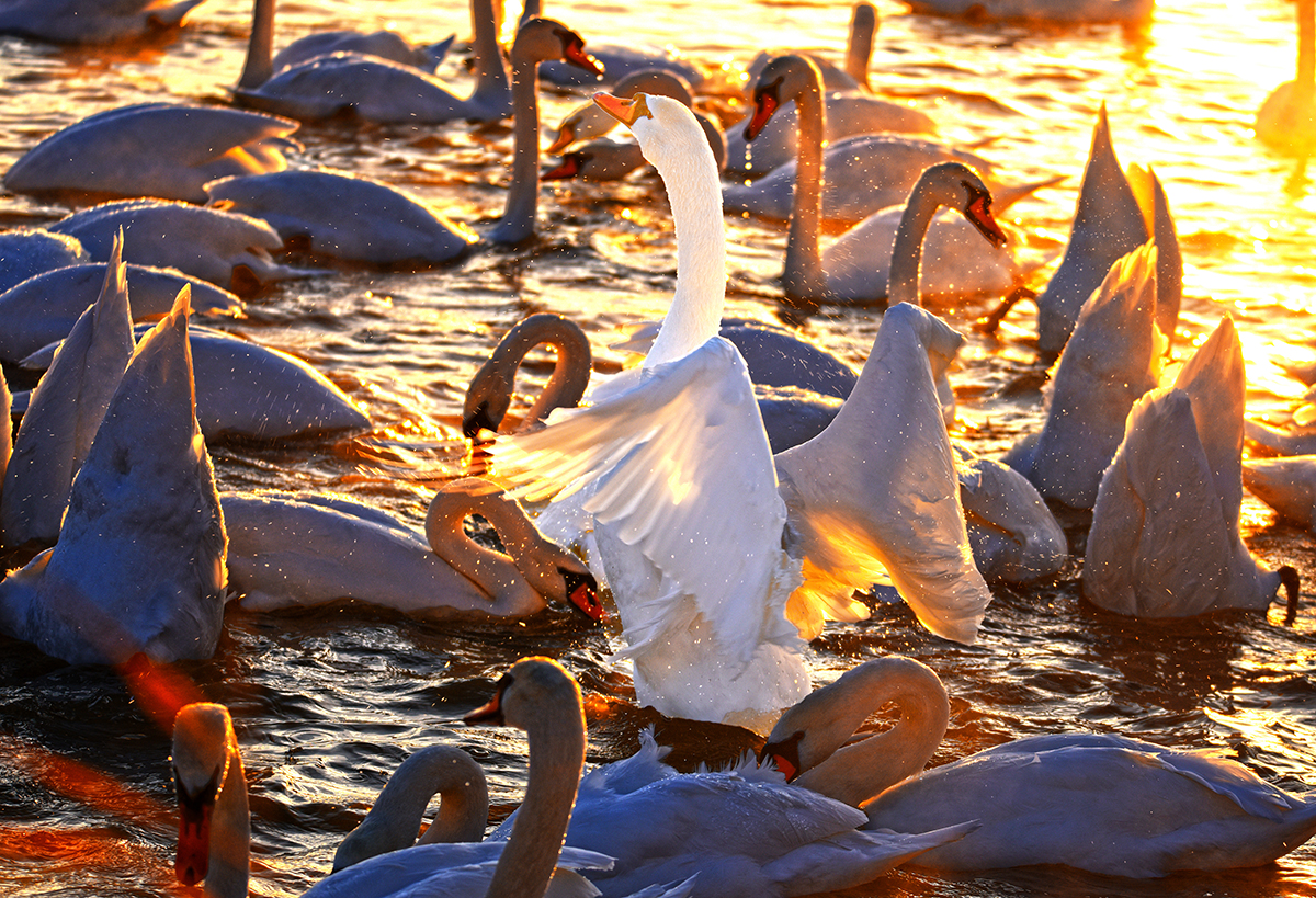 它們或曲項(xiàng)如問(wèn),長(zhǎng)喙輕點(diǎn),在如鏡的水面泛起一圈圈漾著金邊的漣漪;或舒翅欲飛,在氤氳的暖霧與璀璨的霞光間,劃出一道道晶亮的軌跡,仿佛不是在寒水中游弋,而是在熔化的金波上滑行。更有對(duì)對(duì)愛(ài)侶,長(zhǎng)頸交疊,彎成一顆顆溫柔的心的形狀,倒影落在溫暖的泉水中,宛如竊竊私語(yǔ),訴說(shuō)著千里征途中不曾分離的繾綣。