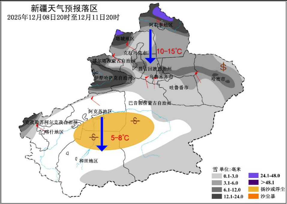 12月8日夜間至11日白天,伊犁河谷山區(qū)、塔城地區(qū)北部、阿勒泰地區(qū)北部東部、昌吉回族自治州東部、哈密市北部等地局部暴雪;全疆大部先后有6級(jí)左右西北風(fēng),風(fēng)口陣風(fēng)13級(jí)左右。