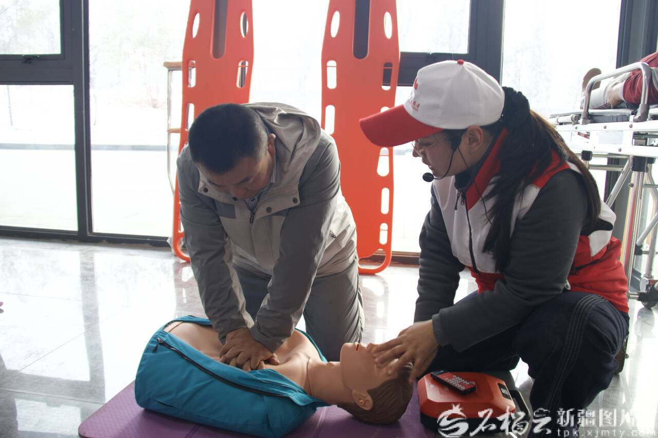 12月5日,烏魯木齊站南廣場(chǎng)紅十字救護(hù)站揭牌啟用,志愿者在進(jìn)行應(yīng)急救護(hù)講解?,斠罒帷つ竞媳攘z