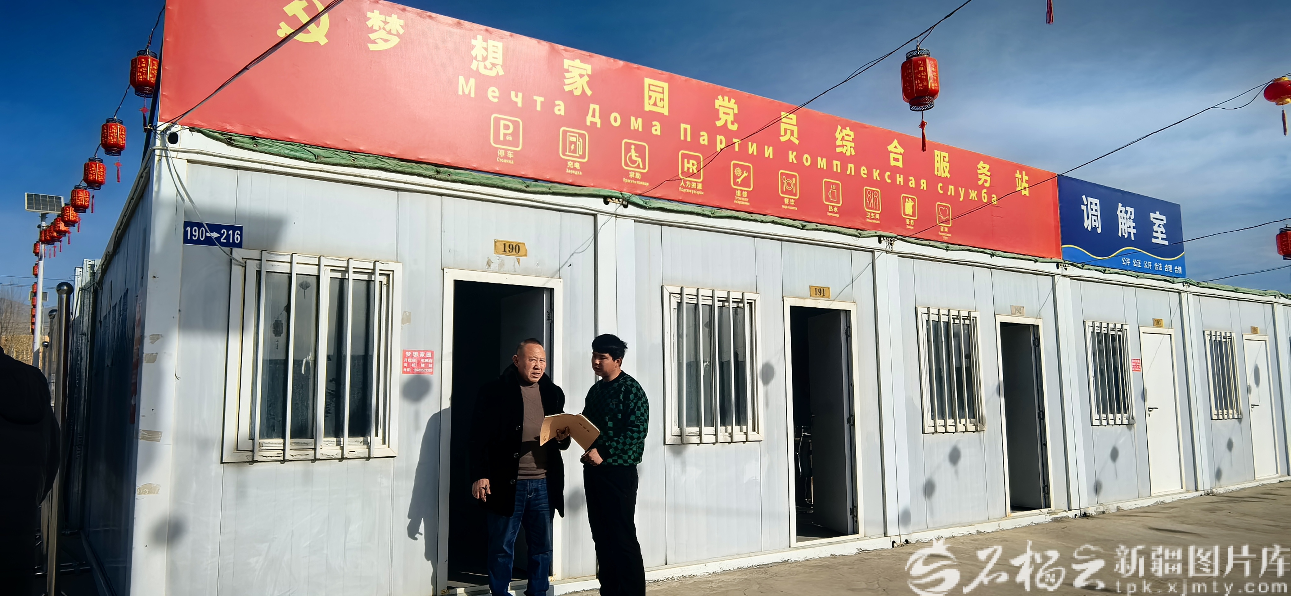 酒店管理人員在“夢想家園”綜合性服務(wù)園區(qū)中的黨員服務(wù)站門前交談。天山網(wǎng)-新疆日報記者 楊舒涵攝