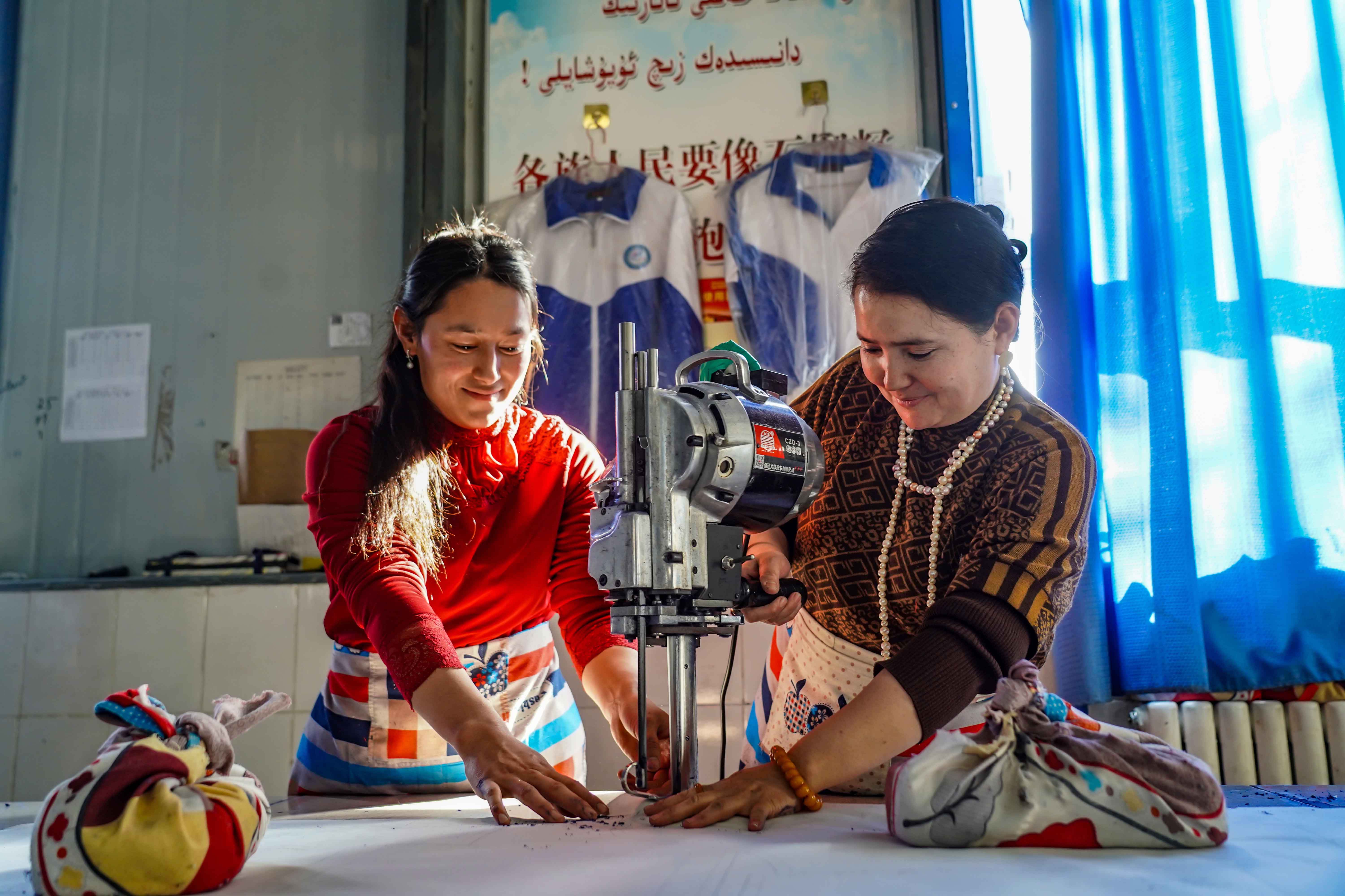 “我現(xiàn)在一個(gè)月能掙2500到3000元。這里離我家很近,中午能回家照顧老人和孩子,農(nóng)忙時(shí)能回家干農(nóng)活,農(nóng)閑時(shí)回廠工作,這種就業(yè)方式很適合我們?!焙吞锸泄沤透襦l(xiāng)賽克散村服裝加工廠員工阿依努爾·肉孜買買提說。