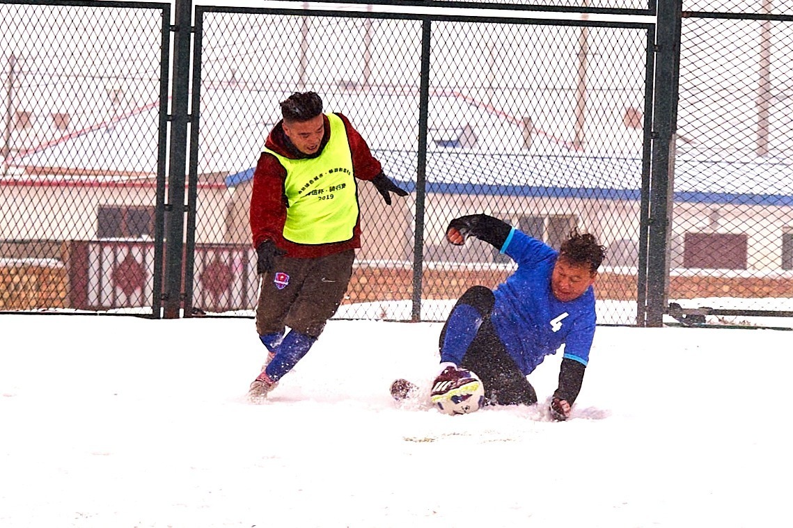 村民在雪地足球賽中激烈拼搶。近日,托里縣舉行了“激情冰雪·相約托里”雪地足球賽,吸引了全縣各鄉(xiāng)鎮(zhèn)8支隊(duì)伍300余人參賽。汪許東攝