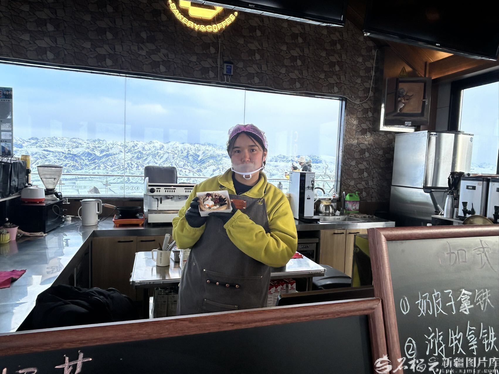 “這是我自創(chuàng)的‘躺平鴨’點心,希望大家來草原放松身心,盡享愜意?!?2月24日,在那拉提景區(qū)索道天界臺站的咖啡店里,咖啡師庫麗孜亞·居瑪西一邊介紹著用馕、酸奶、干果和棉花糖制作的創(chuàng)意點心,一邊熱情招呼游客。
