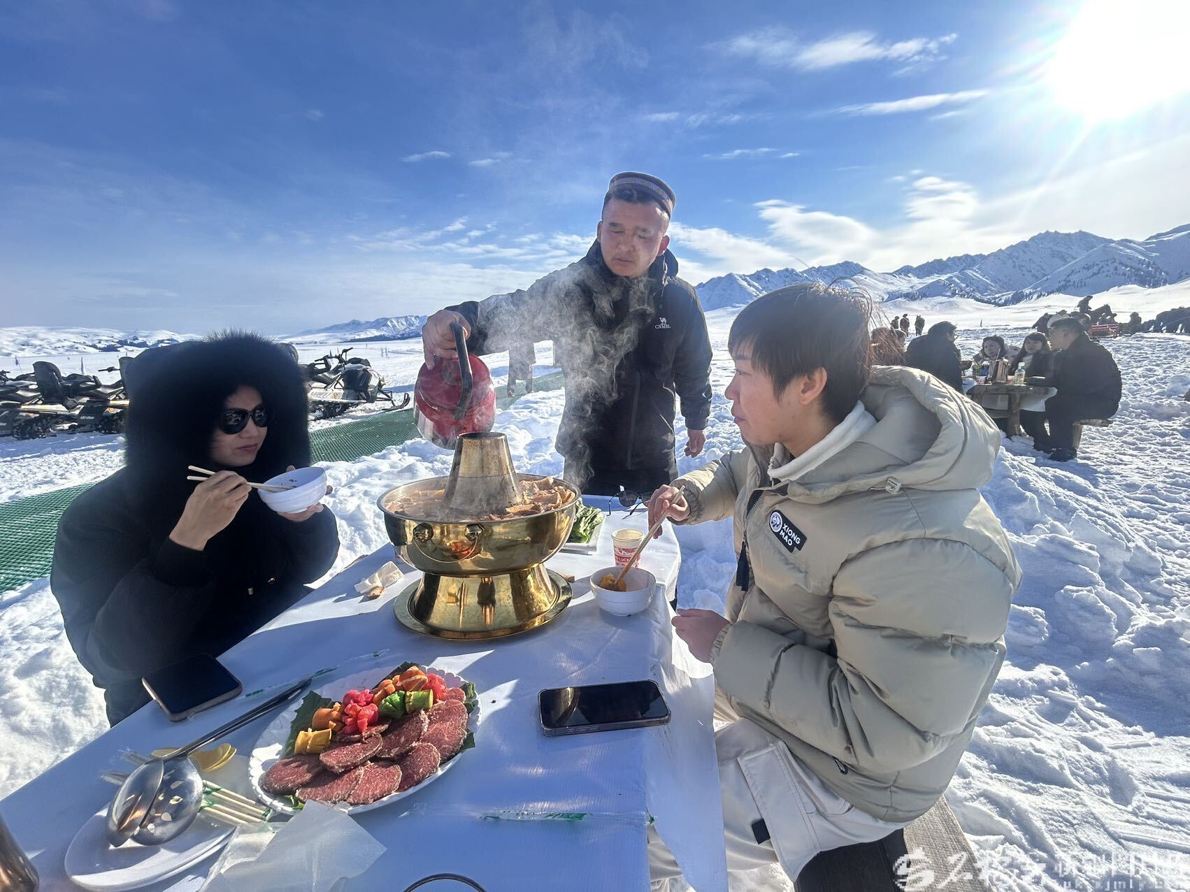 不遠處,天牧臺草原民俗文化體驗區(qū)里,工作人員正在為游客清理出就餐區(qū),端上熱氣騰騰的雪地火鍋。來自廣西的游客楊微第一次在雪地中吃火鍋,感到新鮮有趣?!皠傋暄┑啬ν校F在邊吃火鍋邊看別人玩,有意思?!?/p>