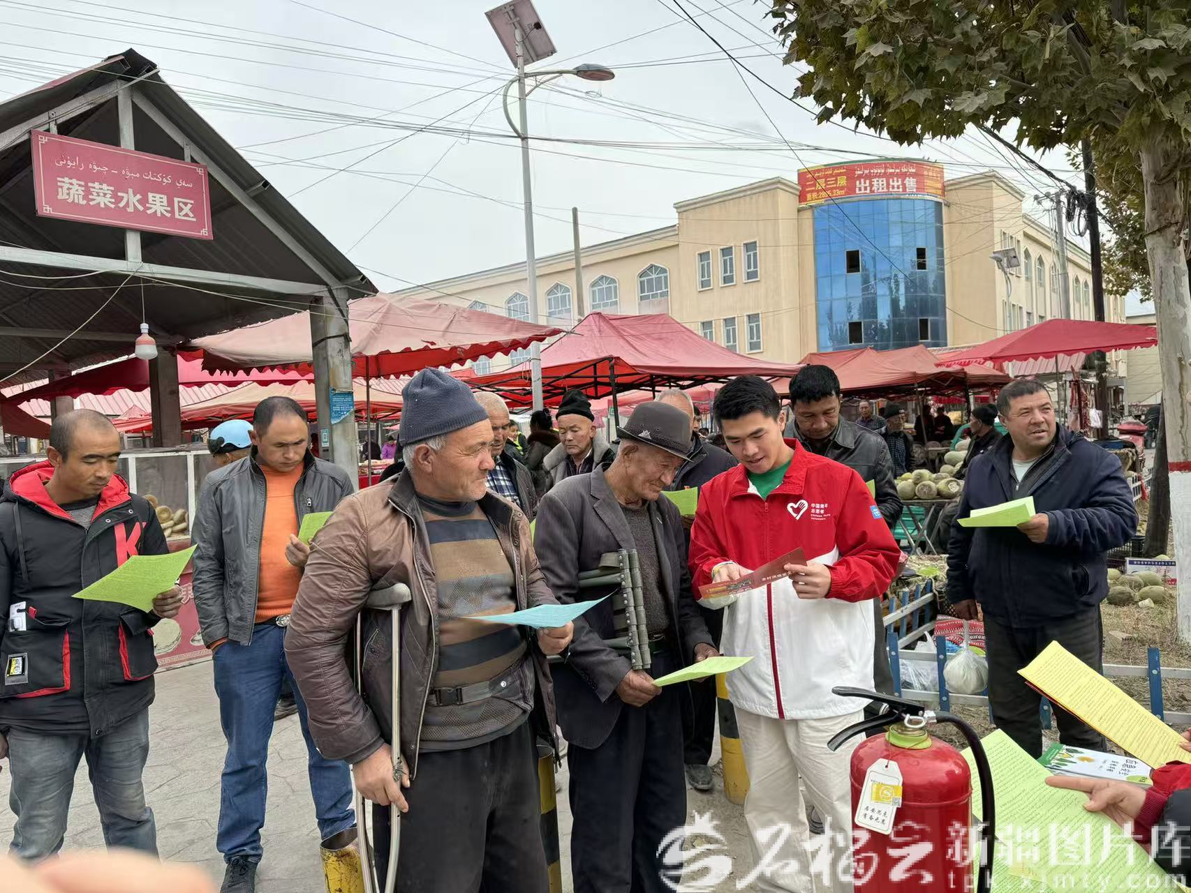 近日,楊爍樺(前右一)在巴扎上向群眾宣傳消防安全知識。本人供圖