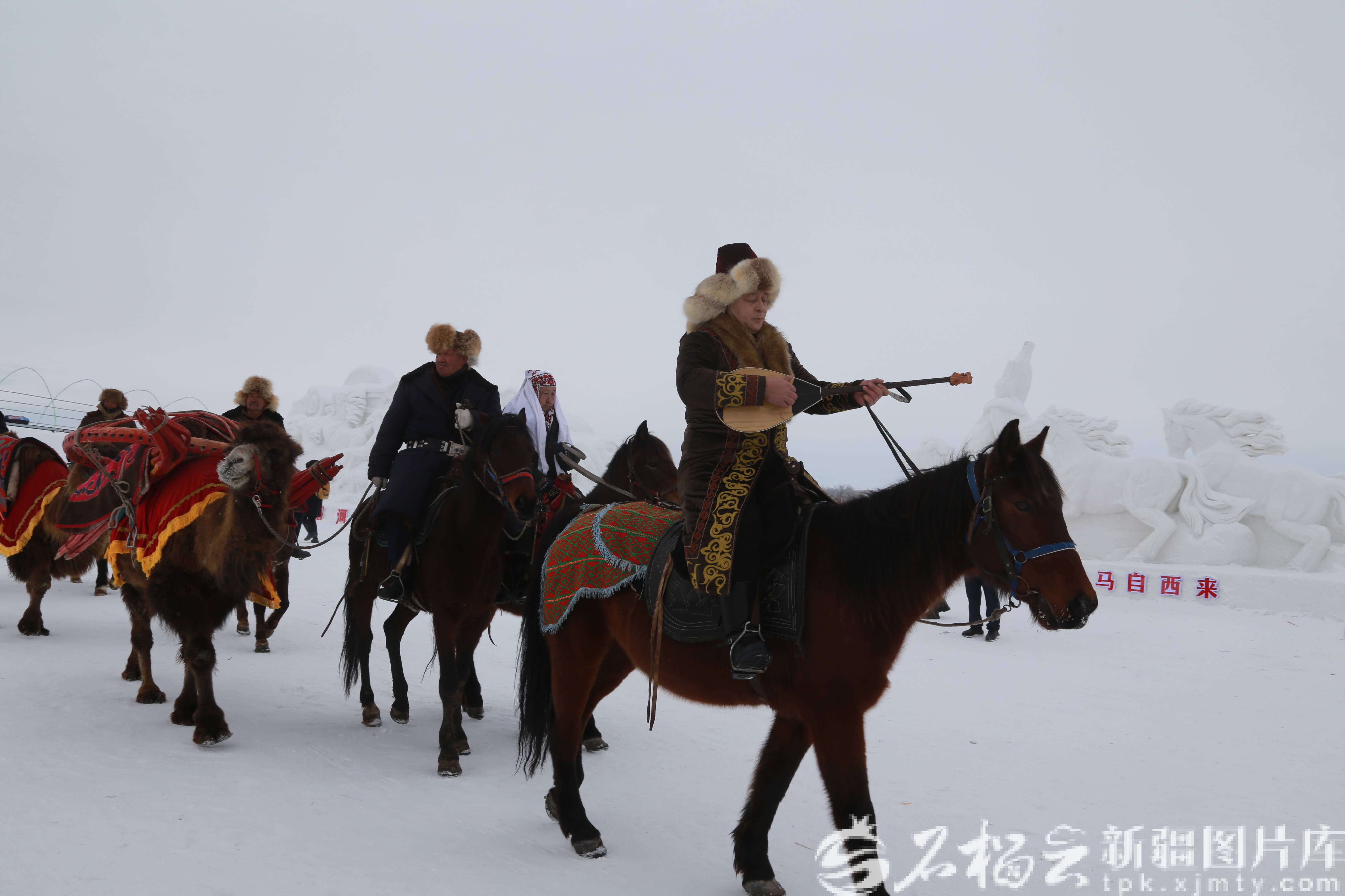 1月1日,阿勒騰別克騎著駿馬、彈著冬不拉,和各地游客一起拉開非遺游園活動序幕。天山網-新疆日報記者 宋衛(wèi)國攝