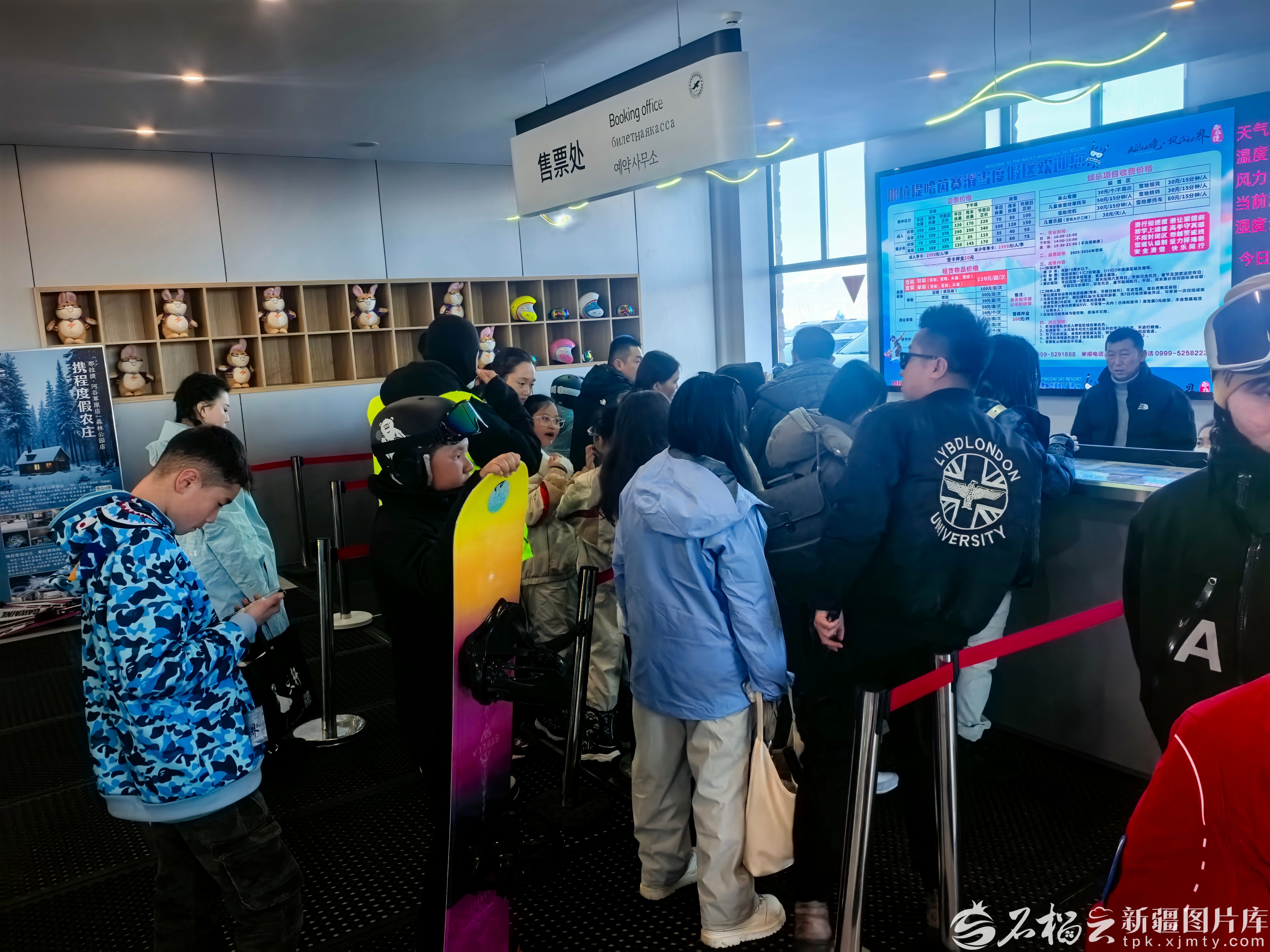1月1日,那拉提哈茵賽滑雪度假區(qū)里,雪友們排隊購票。萬俊輝攝