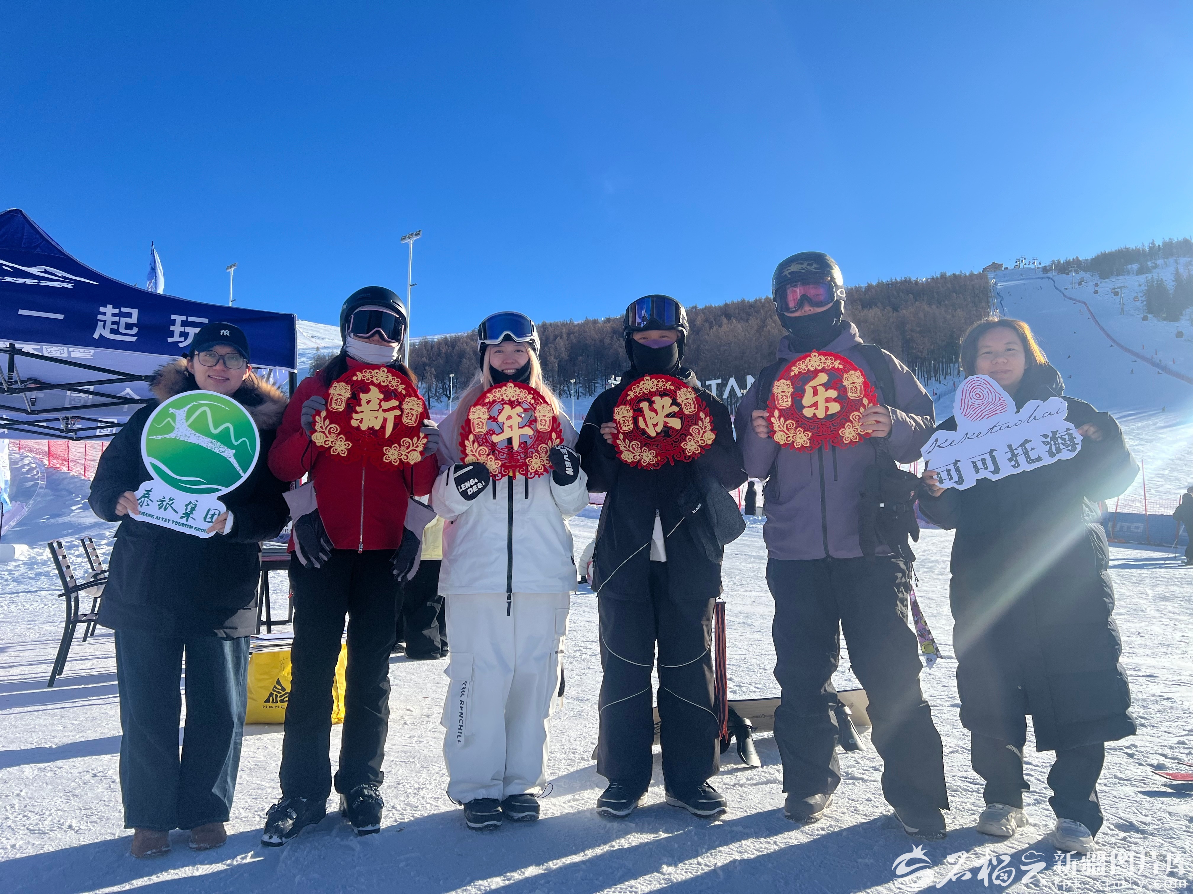 1月1日,雪友在可可托海國際滑雪度假區(qū)參加互動活動并合影。趙婷玉攝