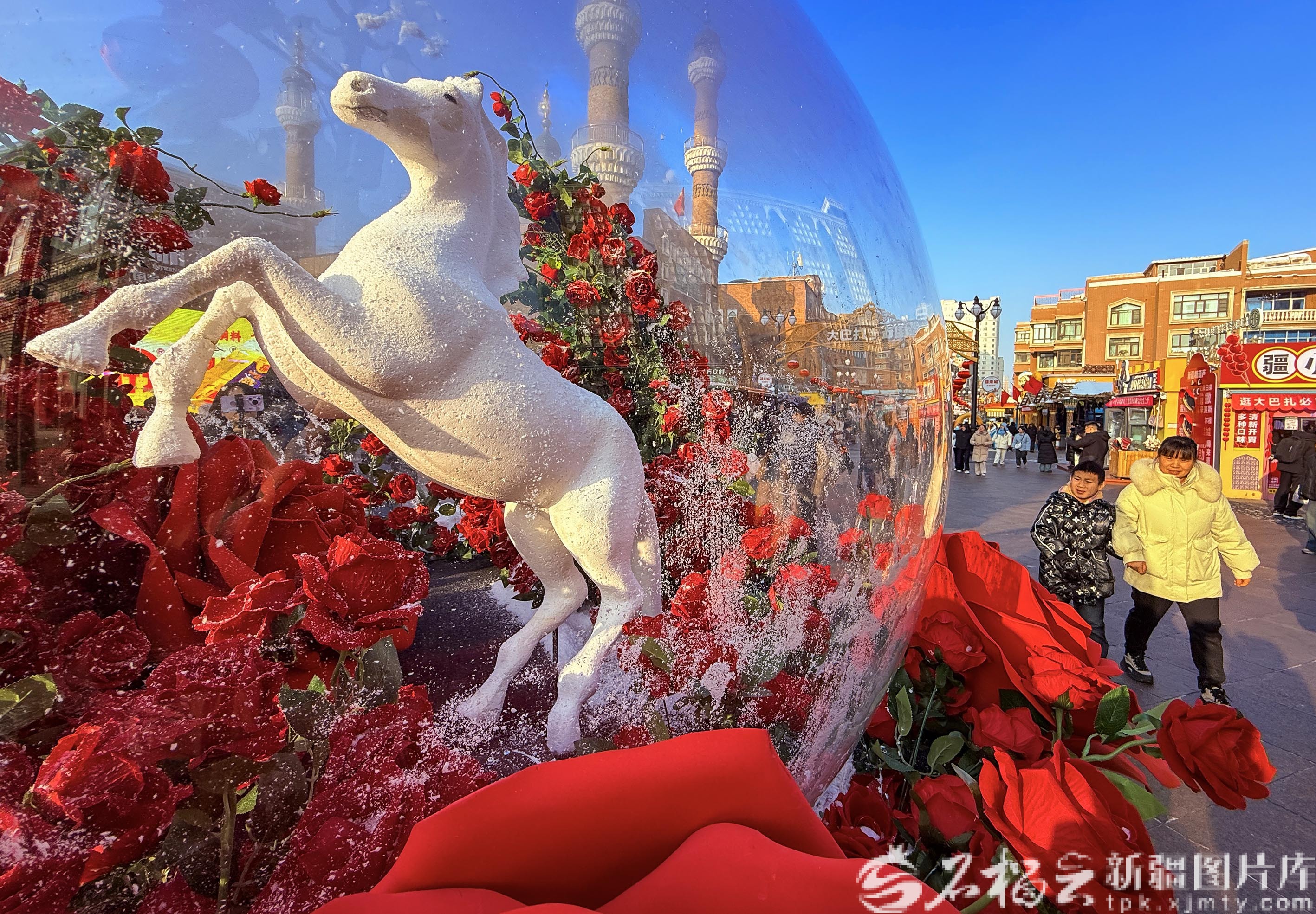 1月1日,新疆國際大巴扎,白色駿馬玻璃球造型景觀吸引游客觀賞。