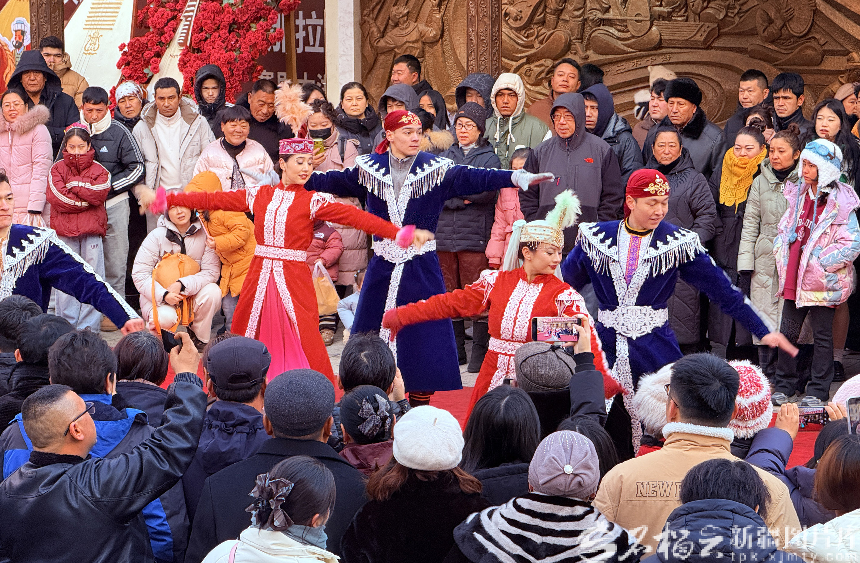1月1日,新疆國際大巴扎,游客在大巴扎步行街二期疆來城觀看歌舞表演。