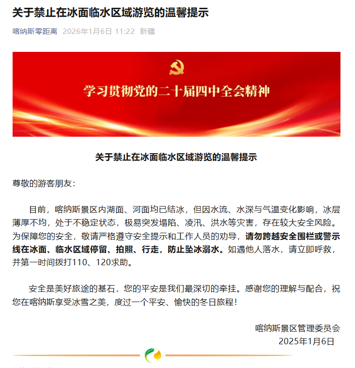 目前,喀納斯景區(qū)內(nèi)湖面、河面均已結(jié)冰,但因水流、水深與氣溫變化影響,冰層薄厚不均,處于不穩(wěn)定狀態(tài),極易突發(fā)塌陷、凌汛、洪水等災(zāi)害,存在較大安全風(fēng)險。為保障您的安全,請嚴(yán)格遵守安全提示和工作人員的勸導(dǎo),請勿跨越安全圍欄或警示線在冰面、臨水區(qū)域停留、拍照、行走,防止墜冰溺水。如遇他人落水,請立即呼救,并第一時間撥打110、120求助。