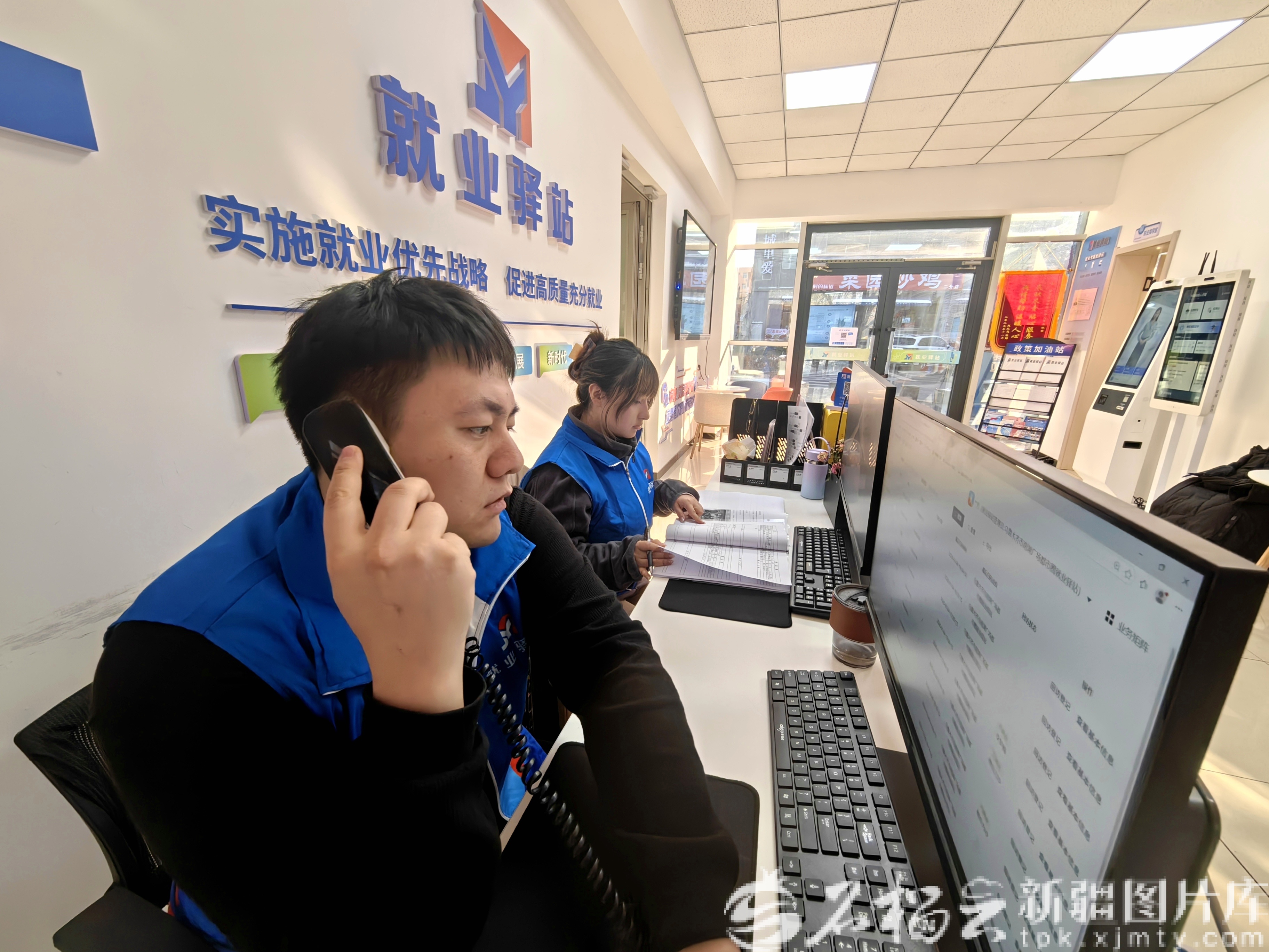 1月6日,在水磨溝區(qū)“2026屆高校畢業(yè)生”線上招聘會(huì)現(xiàn)場(chǎng), 南湖廣場(chǎng)就業(yè)驛站工作人員在給中國新疆人才網(wǎng)上的求職者撥打回訪電話,詢問是否找到心儀工作。