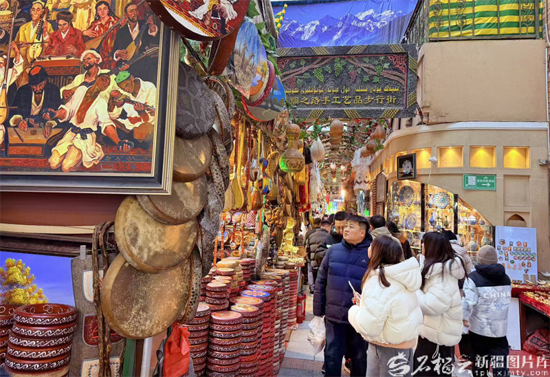 1月8日,游客在新疆國際大巴扎手工藝品特色街區(qū)游覽。冬日的大巴扎人流如織,來自各地的游客在此沉浸式感受著新疆熱情多元、和諧共生的文化脈搏。天山網(wǎng)-新疆日報記者約提克爾·尼加提攝
