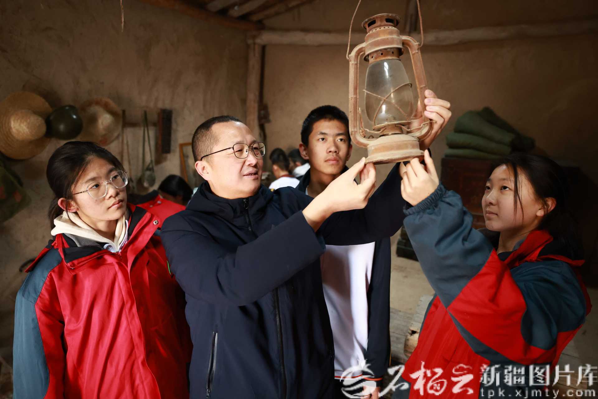 1月7日,范占國帶領(lǐng)學生觀摩老舊馬燈,講解老一輩建設(shè)者扎根新疆的故事。周常樂 攝