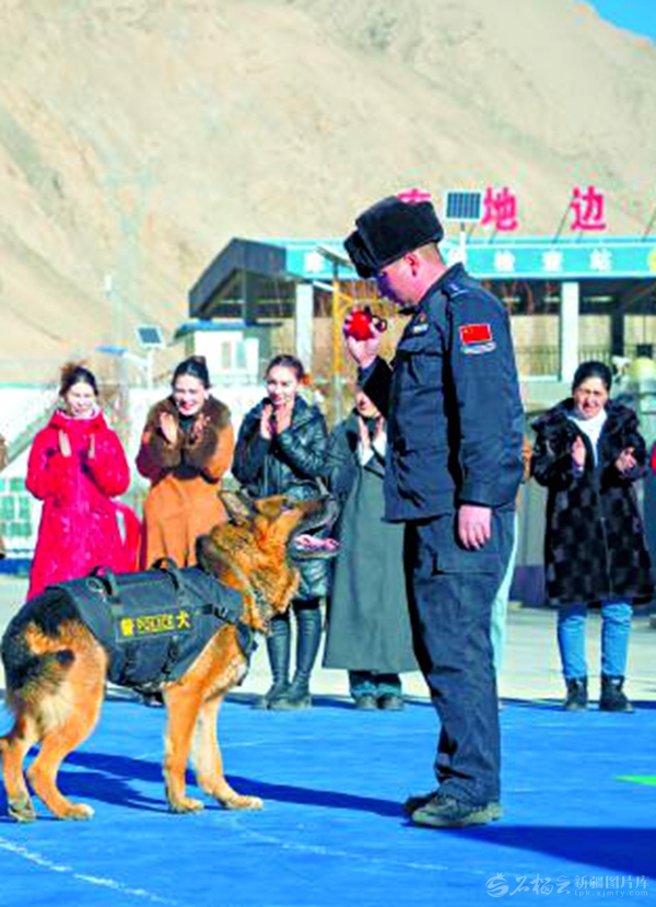 1月8日,新疆出入境邊防檢查總站喀什邊境管理支隊(duì)庫(kù)地邊境檢查站民警向駐地群眾展示警犬技能。 何偉攝