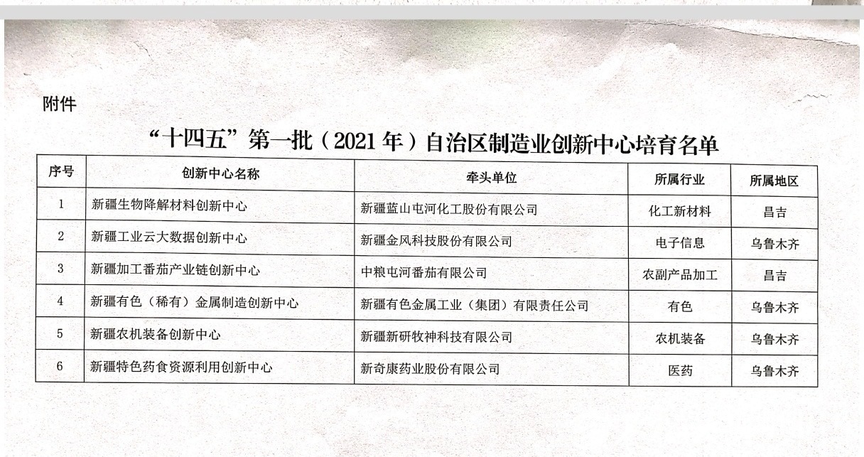 自治區(qū)工業(yè)和信息化廳發(fā)布的“十四五”第一批(2021年)自治區(qū)制造業(yè)創(chuàng)新中心培育名單截圖。