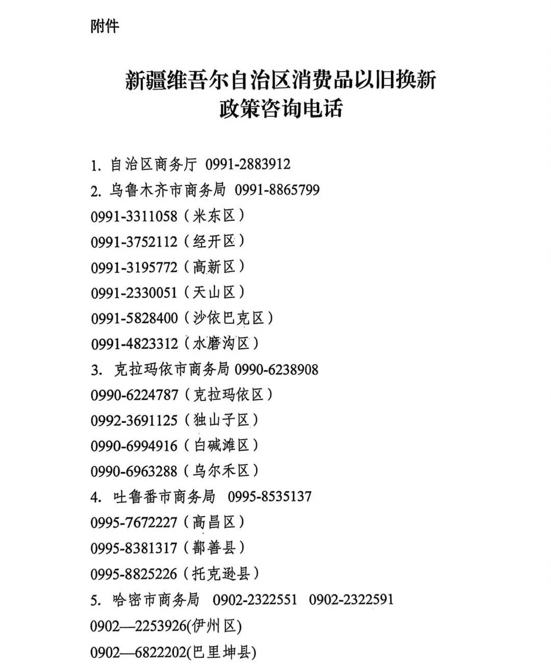 附件:新疆維吾爾自治區(qū)消費(fèi)品以舊換新政策咨詢電話