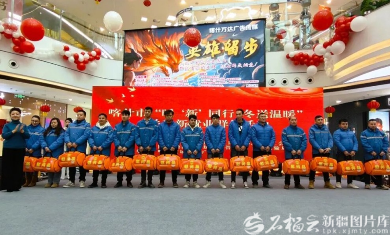 喀什市“暖‘新’通行冬送溫暖 關(guān)愛(ài)新就業(yè)群體”活動(dòng)現(xiàn)場(chǎng),為快遞從業(yè)人員發(fā)放御寒棉被??κ驳貐^(qū)郵政管理局供圖