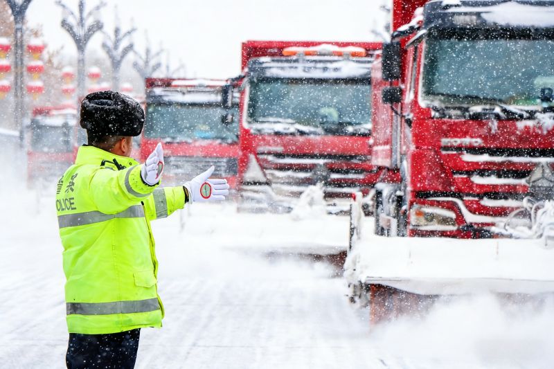 極端天氣給群眾出行和生產(chǎn)生活帶來(lái)嚴(yán)峻挑戰(zhàn),奎屯市公安局交警指揮清雪車輛通行。奎屯市融媒體中心供圖