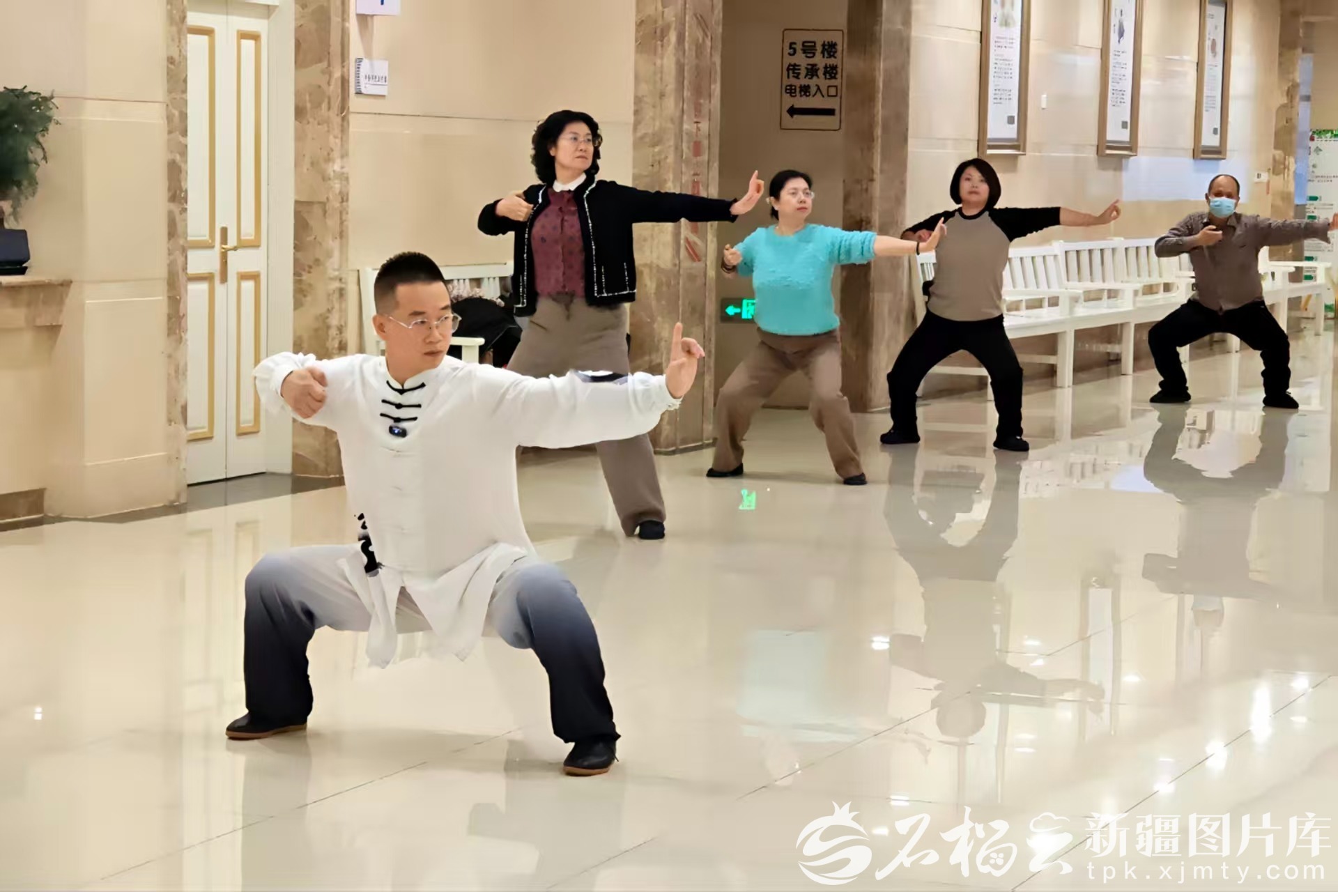 1月19日,新疆醫(yī)科大學第四附屬醫(yī)院(自治區(qū)中醫(yī)醫(yī)院)推拿科門診大廳,主治醫(yī)師楊龍江一邊直播,一邊帶著患者鍛煉身體。天山網(wǎng)-新疆日報記者 蘇璐萍攝