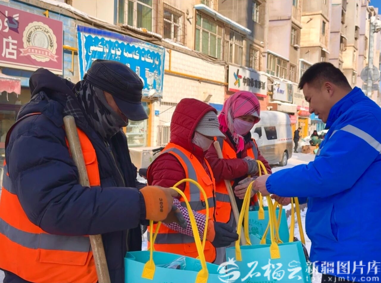 在烏魯木齊市,中通快遞“有你的冬天不太冷”活動“送溫暖”現(xiàn)場,除給快遞小哥外還給環(huán)衛(wèi)工人送了御寒物資。張鹍攝