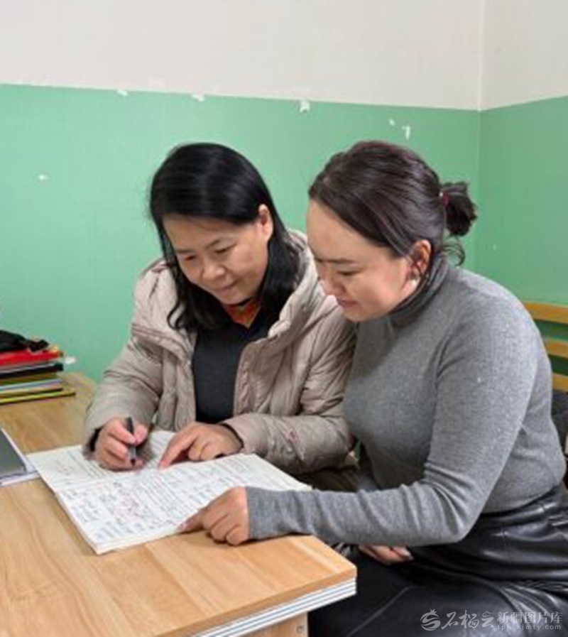 1月12日,江西援疆教師謝久蓮(左)和當(dāng)?shù)亟處煿披惏⒃帷滬溙崦鞑⒓缍?,一起研磨高中語文課教案。江西省對口支援新疆工作前方指揮部供圖