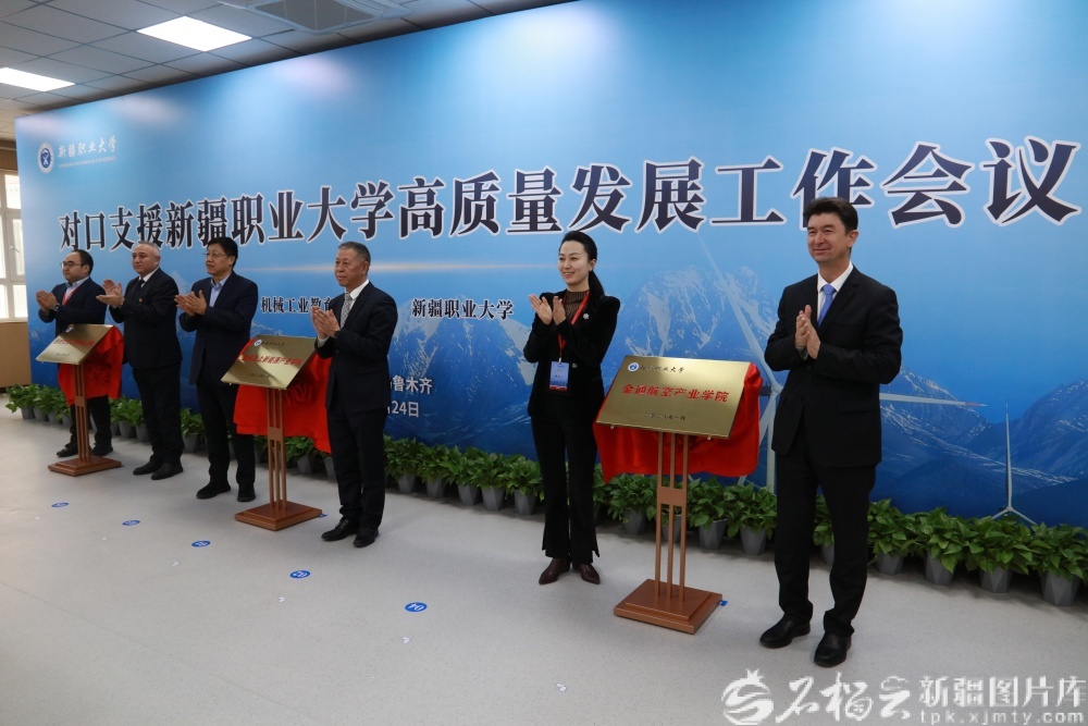 1月24日,對口支援新疆職業(yè)大學高質(zhì)量發(fā)展工作會議召開。現(xiàn)場,金通航空產(chǎn)業(yè)學院、金風北上新能源產(chǎn)業(yè)學院、新航航空工程產(chǎn)業(yè)學院揭牌成立。圖片由新疆職業(yè)大學提供