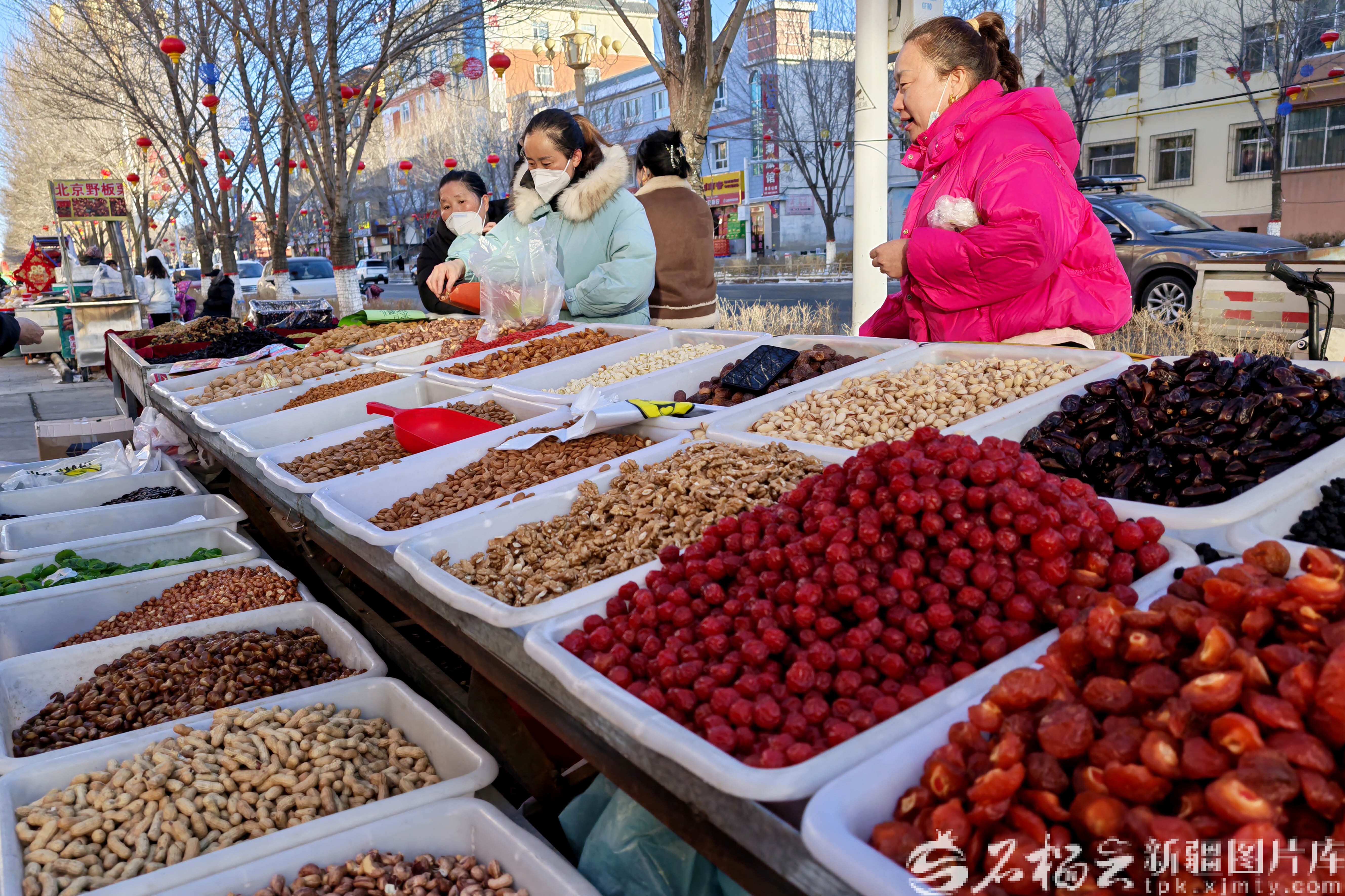 2月9日,巴里坤哈薩克自治縣街頭,顧客在選購干果。