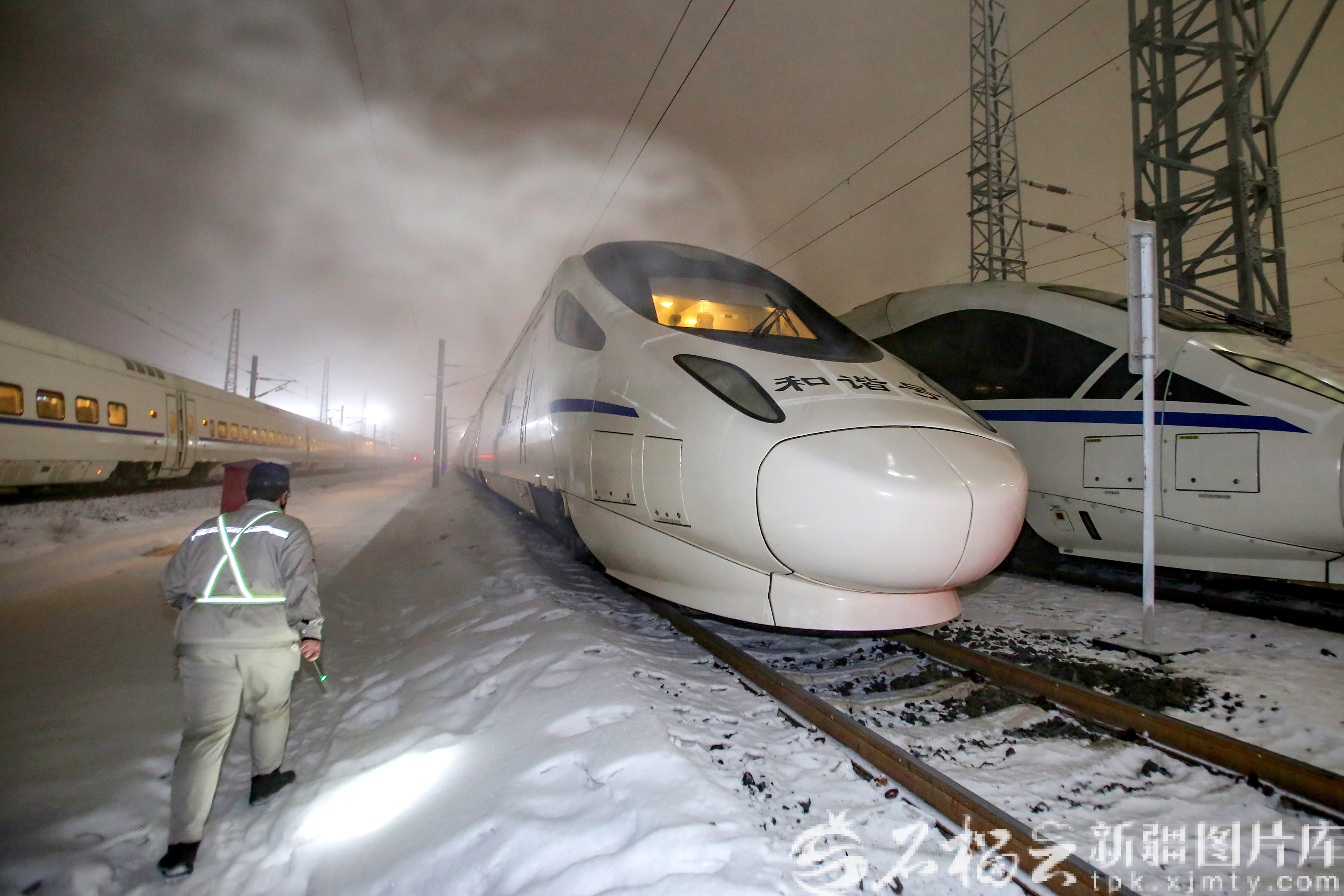 2月5日,機(jī)械師在存車(chē)場(chǎng)巡視檢查整裝待發(fā)的動(dòng)車(chē)組列車(chē),他們每?jī)尚r(shí)要對(duì)存車(chē)場(chǎng)的動(dòng)車(chē)組列車(chē)進(jìn)行防寒打溫,時(shí)刻保障動(dòng)車(chē)組列車(chē)的良好狀態(tài)。