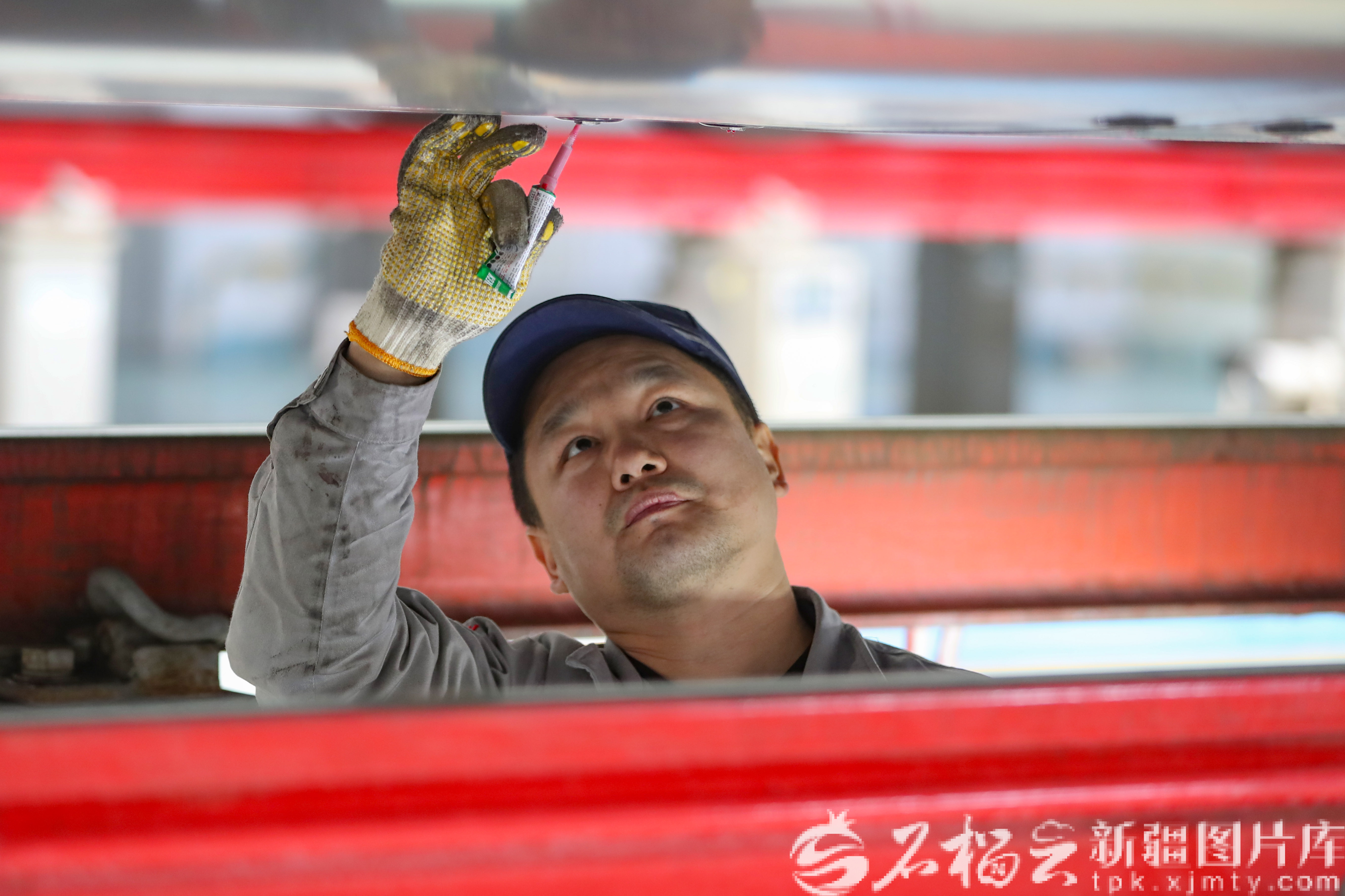 2月4日,機(jī)械師阿里木·衣明在動(dòng)車(chē)底為檢查維護(hù)完成的動(dòng)車(chē)部件做安全標(biāo)記,阿里木在這里經(jīng)過(guò)了11年的鍛煉已成為動(dòng)車(chē)片區(qū)的行家里手。
