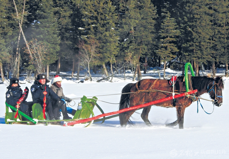 2月14日,新疆出入境邊防檢查總站阿勒泰邊境管理支隊喀納斯邊境派出所組織民警和護邊員利用馬拉爬犁,將年貨送到邊遠牧區(qū)牧民手中。蔣慧芳 攝