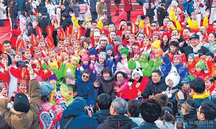 2月14日,新疆國際大巴扎景區(qū),觀眾和社火隊隊員一起拍照,在歡聲笑語中喜迎新春佳節(jié)的到來。孫振嵩 攝