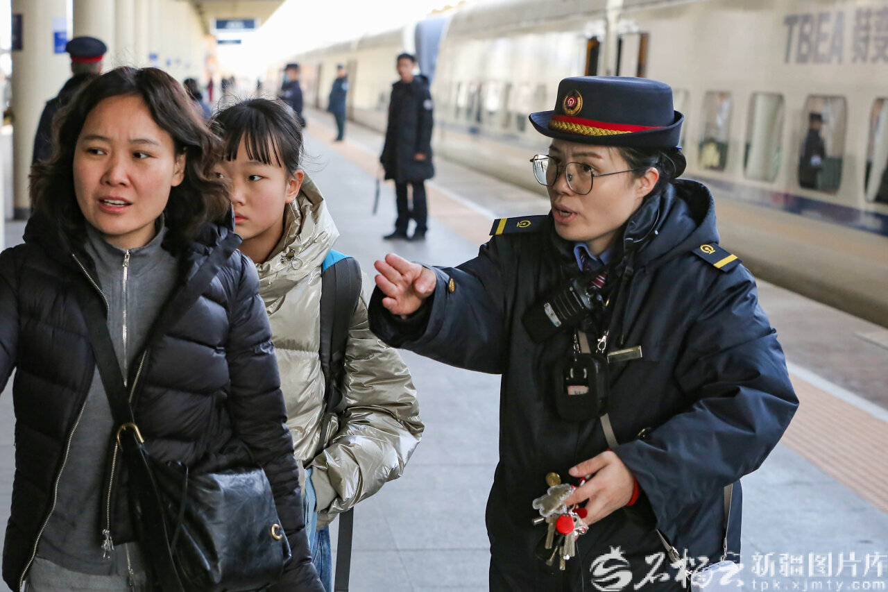 2月19日,哈密火車站客運(yùn)值班員張慧引導(dǎo)旅客換乘。