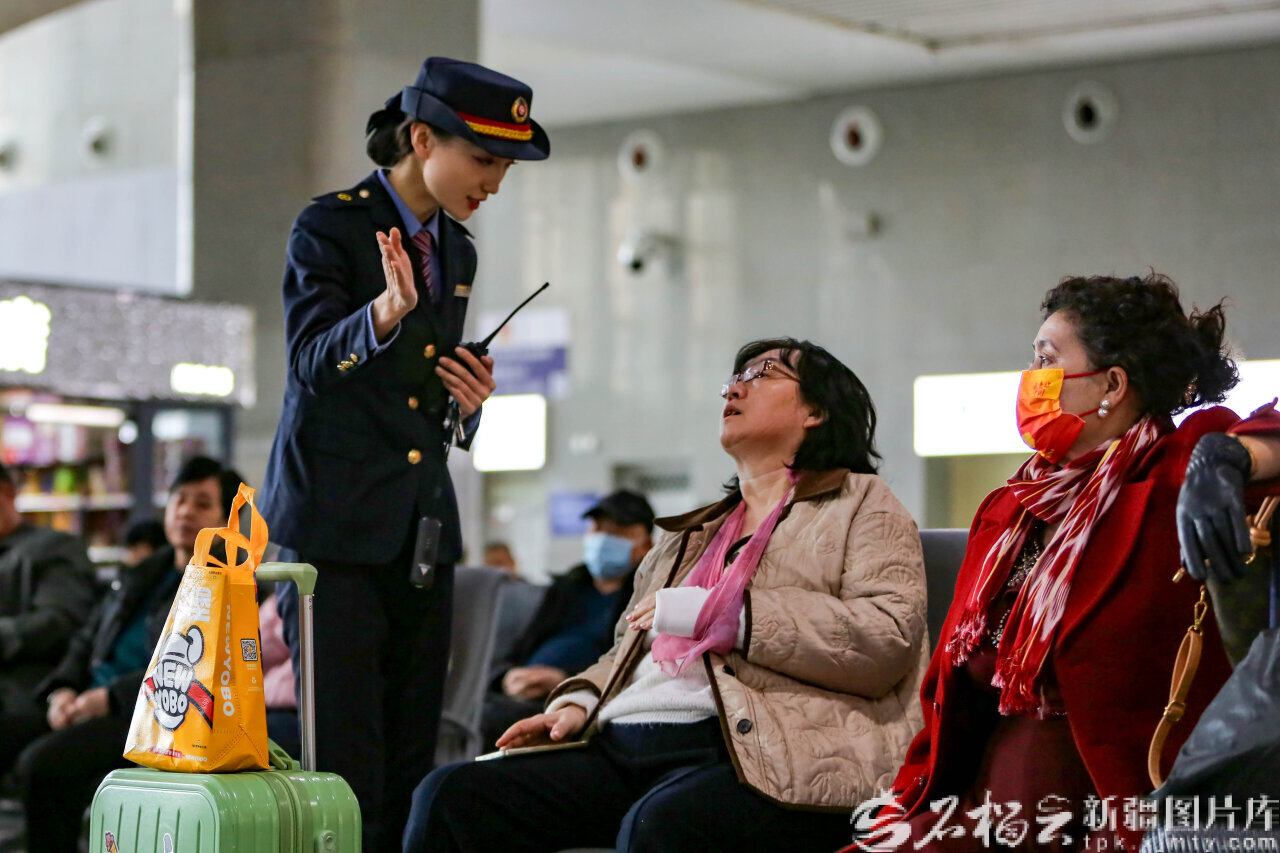 2月19日,哈密火車站候車室客運(yùn)員迪麗胡瑪爾·阿里木正忙碌地引導(dǎo)旅客檢票登車