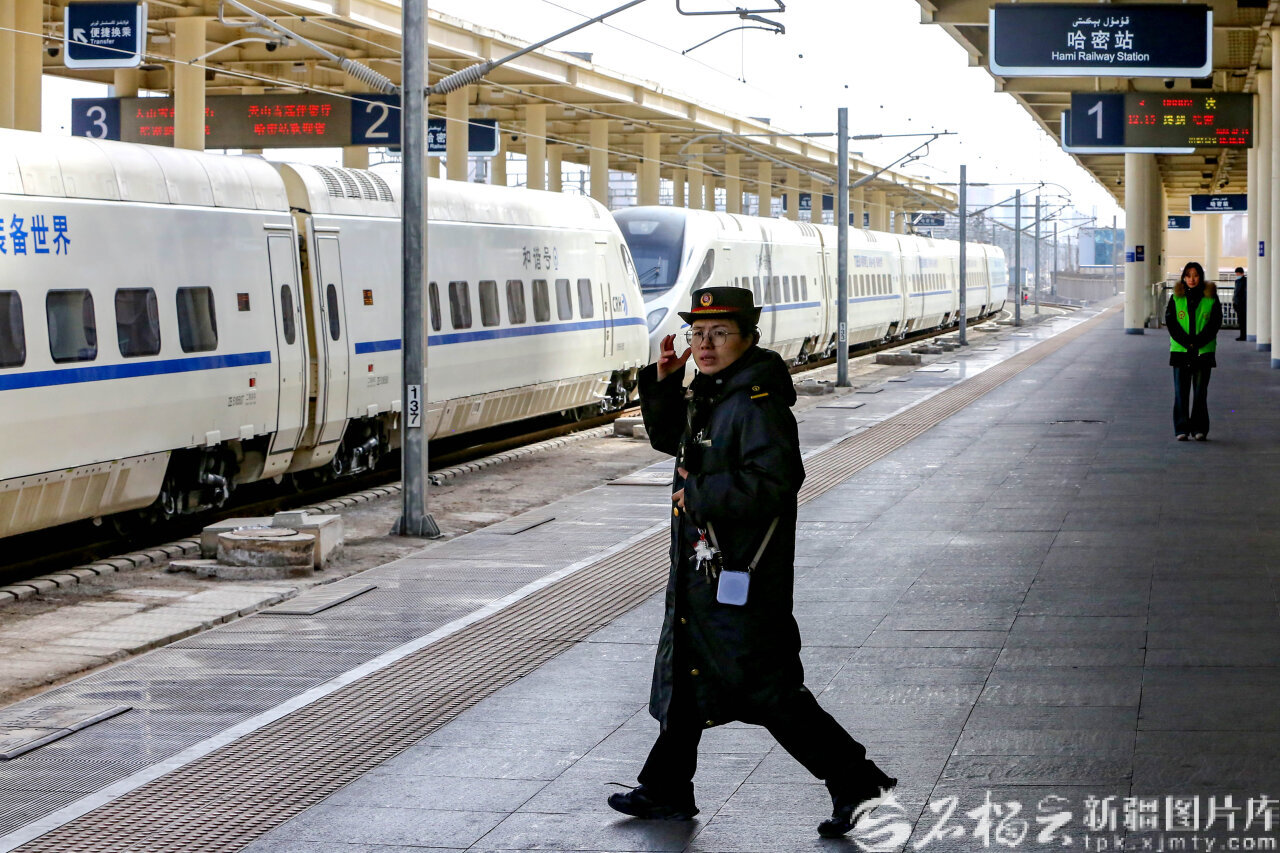 2月19日,哈密火車站客運(yùn)值班員張慧準(zhǔn)備迎接到站列車。