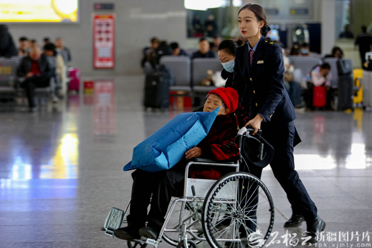 2月19日,哈密火車站候車室客運(yùn)員趙雪雁幫助特殊旅客進(jìn)站。