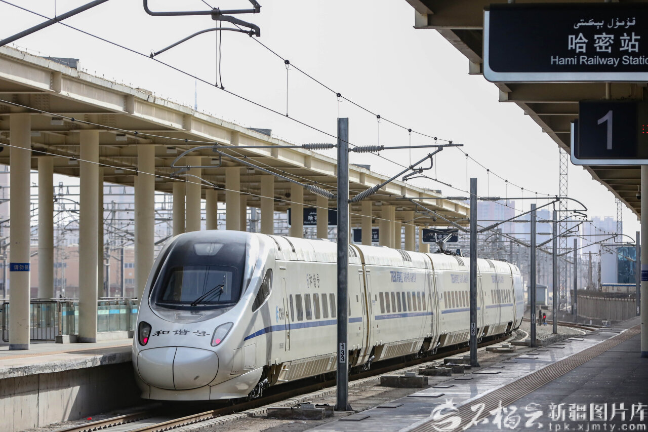 2月19日,一列動車組列車從哈密火車站緩緩駛出。