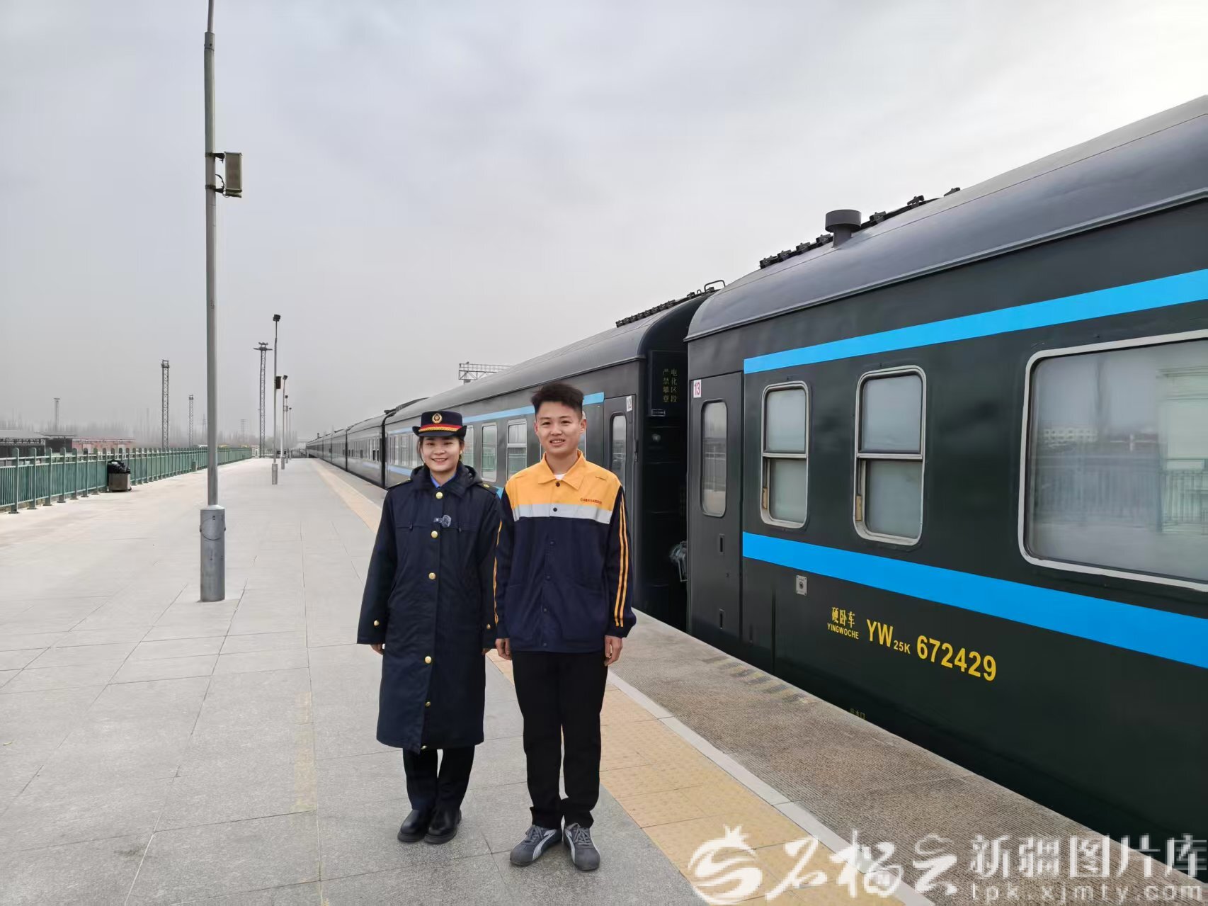 工作間隙,龍宏霄和王嬌在庫(kù)車(chē)站站臺(tái)上合影。天山網(wǎng)-新疆日?qǐng)?bào)記者 張治立攝