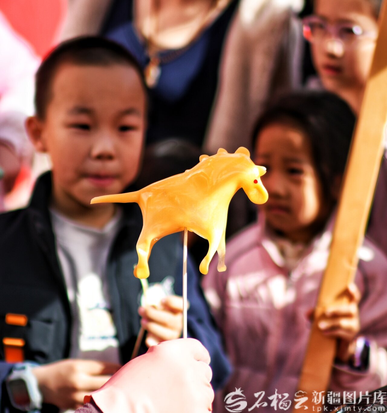 2月22日,庫(kù)爾勒梨城美食街,小朋友在觀賞糖塑技藝。天山網(wǎng)-新疆日?qǐng)?bào)記者 王立華攝