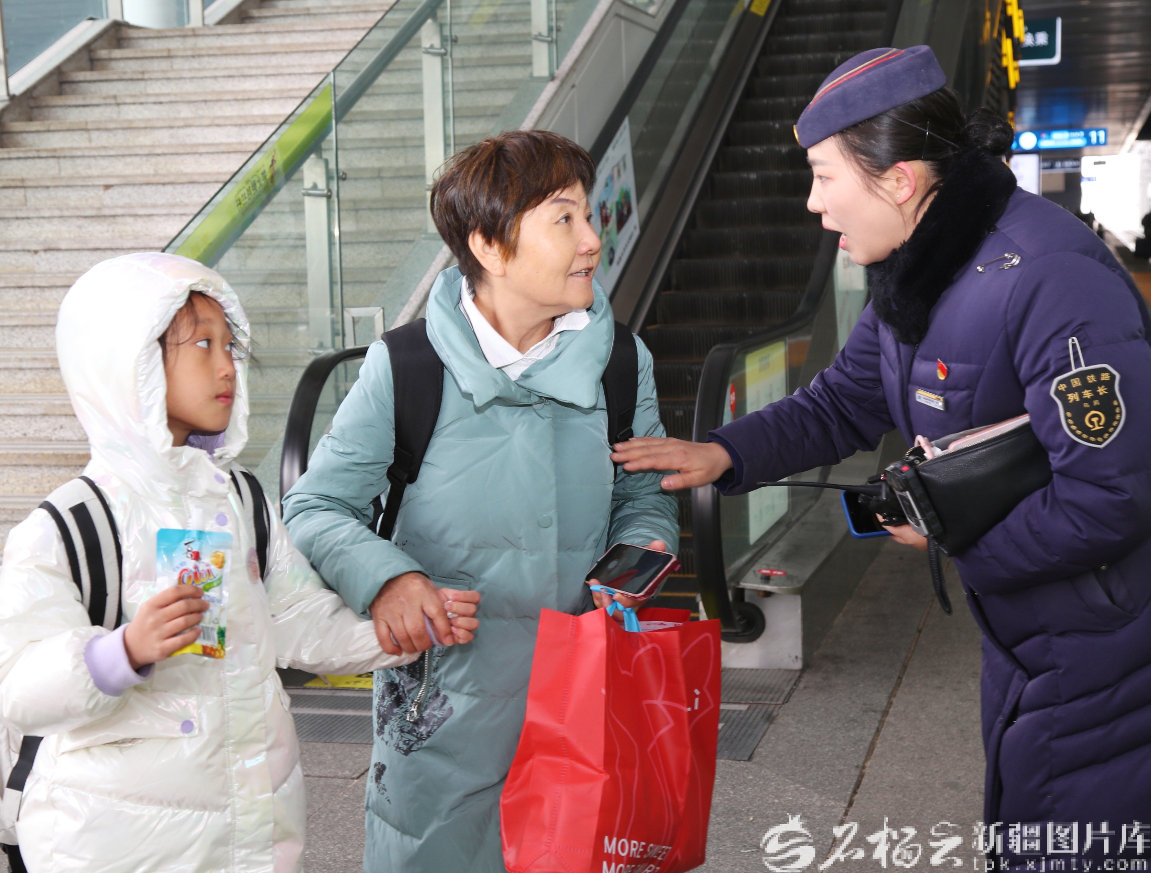 3月2日,烏魯木齊站客運(yùn)站工作人員董靜檢票并引導(dǎo)旅客乘車。