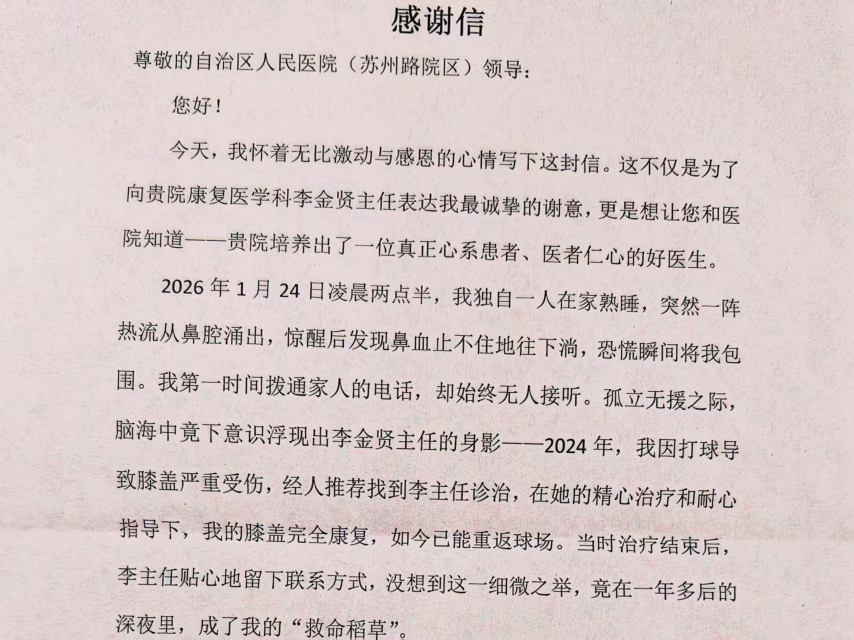 近日,一封感謝信在自治區(qū)人民醫(yī)院刷屏。寫信人李麗(化名)要感謝的,是康復醫(yī)學科主任李金賢。1月24日凌晨兩點半,那個只響了幾秒就接通的電話,成了她在黑暗中看到的最亮的光。