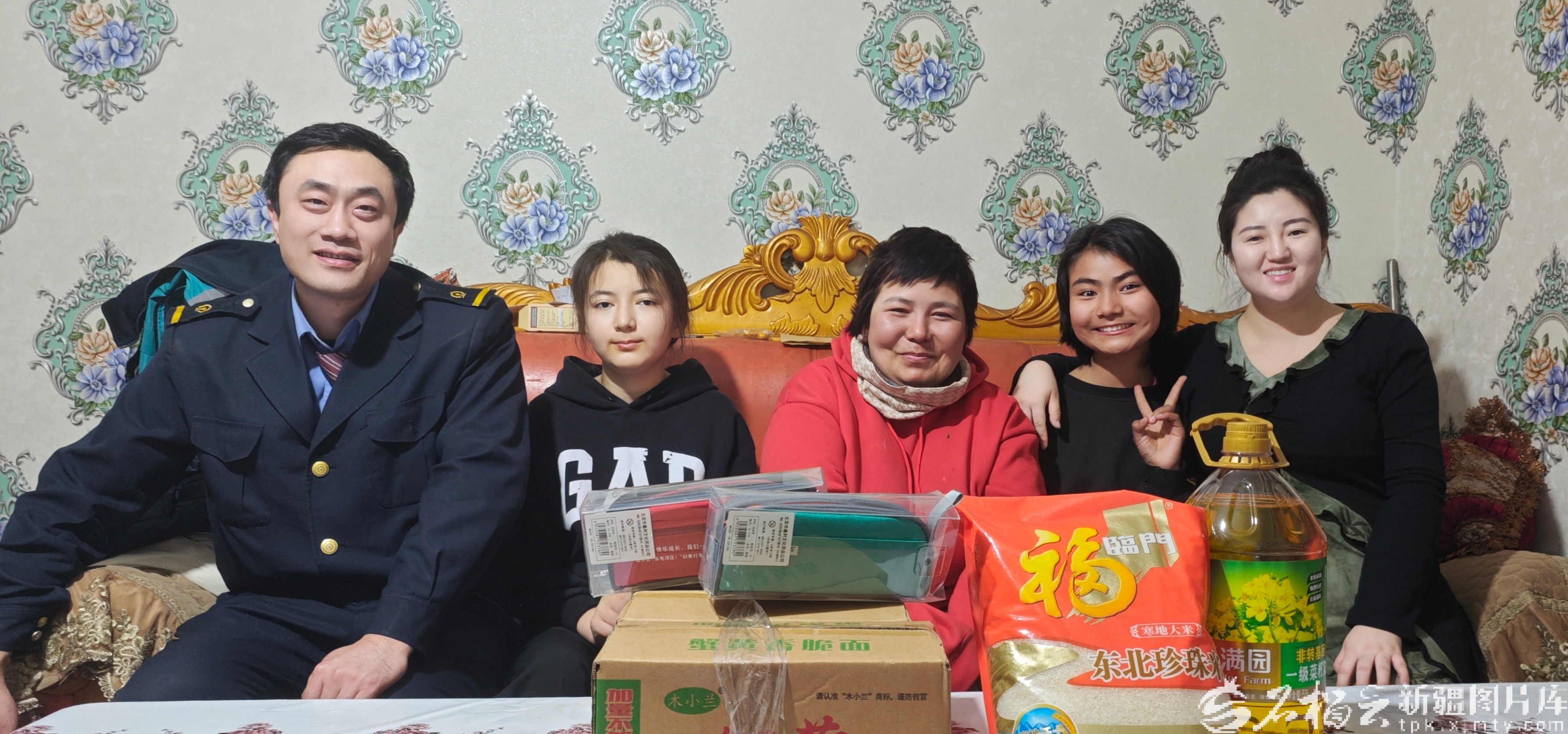 3月19日,毛曉彤(右一)夫婦下班后來到阿爾孜古麗·色買提(右三)家中看望孩子們并送上過節(jié)禮品。天山網(wǎng)-新疆日?qǐng)?bào)記者 魏紅萍攝
