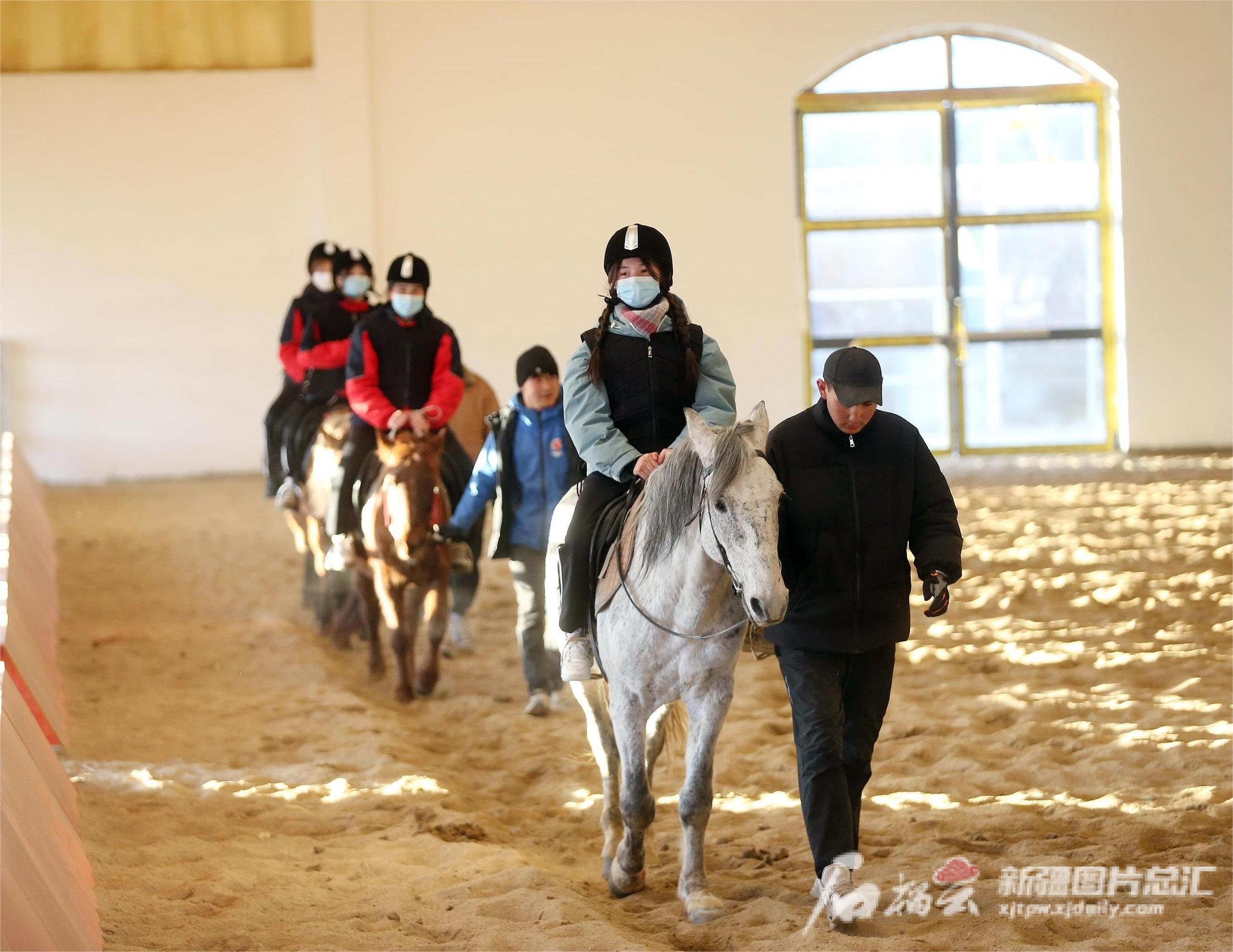 2022年12月12日,在阿勒泰市金血馬場,學(xué)生們正在馬術(shù)培訓(xùn)課上跟隨老師學(xué)習(xí)騎馬。天山網(wǎng)-新疆日報記者 李瑞攝