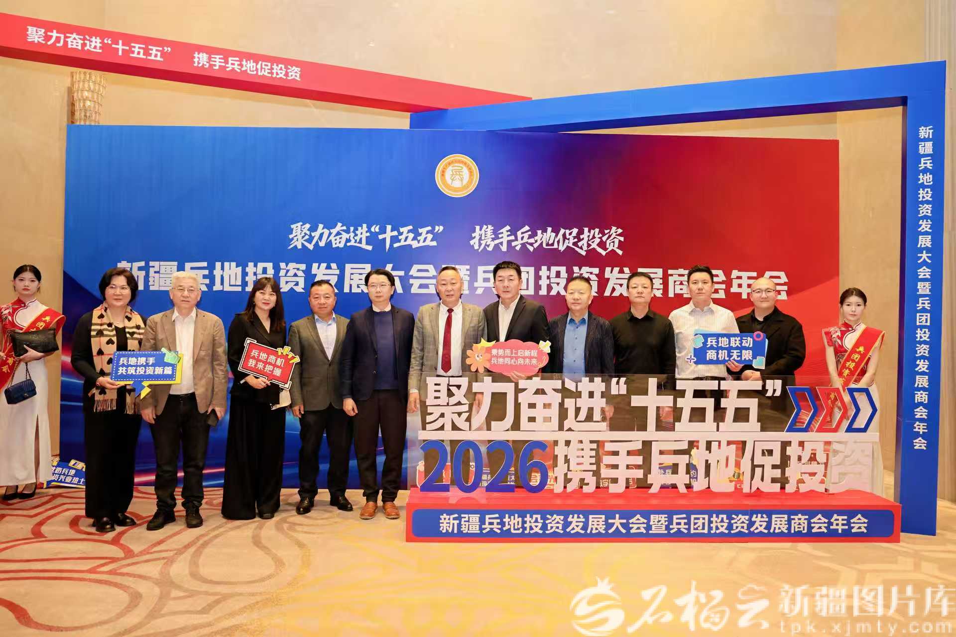 1月17日,新疆兵地投資發(fā)展大會暨兵團(tuán)投資發(fā)展商會年會上,自治區(qū)和新疆生產(chǎn)建設(shè)兵團(tuán)的參會嘉賓爭相在會標(biāo)前留影。周衛(wèi) 攝