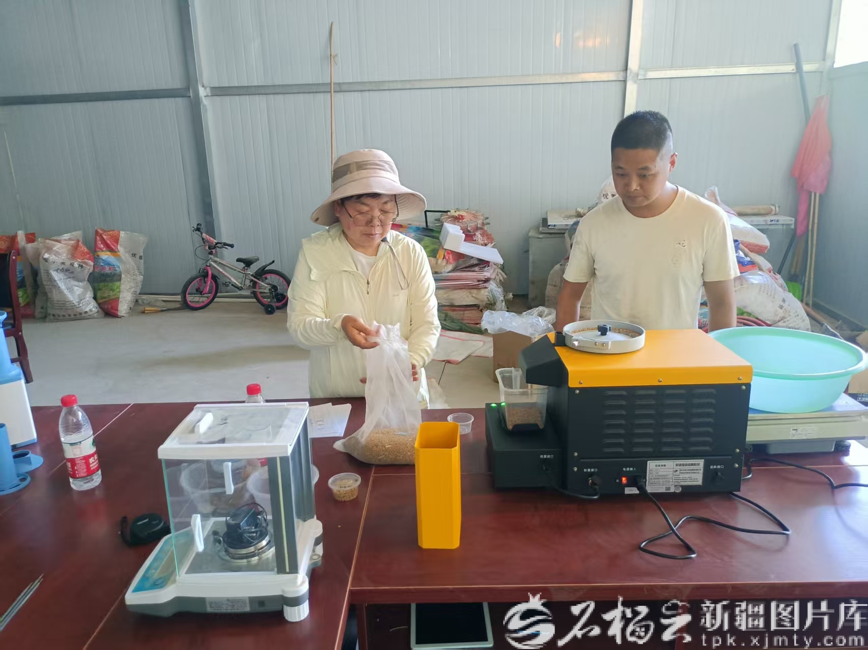 2025年7月3日,關(guān)麗菊(左)進(jìn)行小麥品種試驗(yàn)區(qū)千粒重稱重。本人供圖