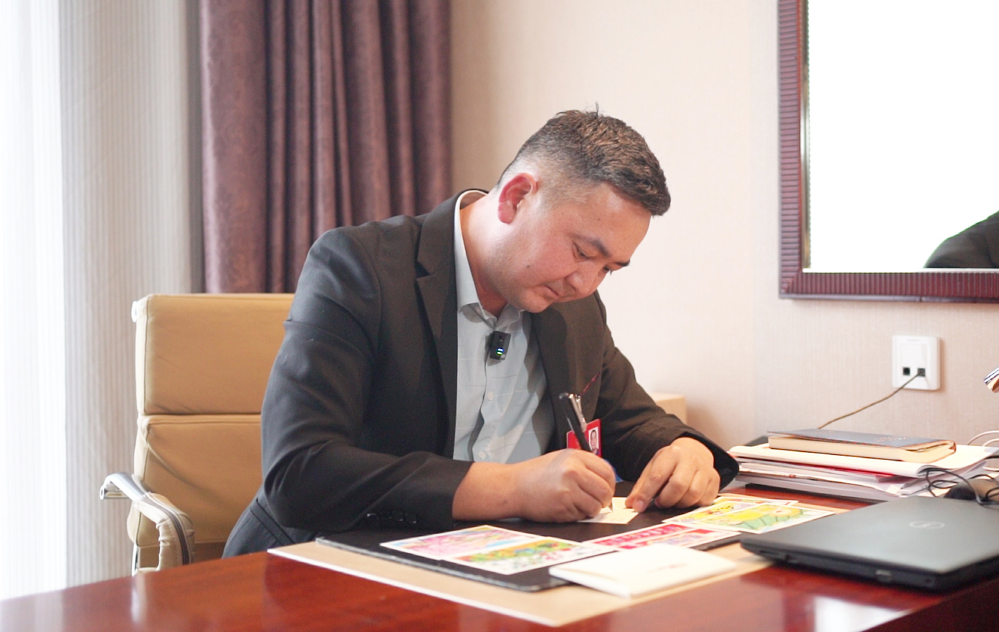 1月28日,自治區(qū)人大代表、新疆豐圖建設(shè)工程有限公司財(cái)務(wù)主管阿衣本·吾爾達(dá)拜在給“童繪新疆”小作者寫寄語。(攝影:加木布拉提·馬那爾別克)