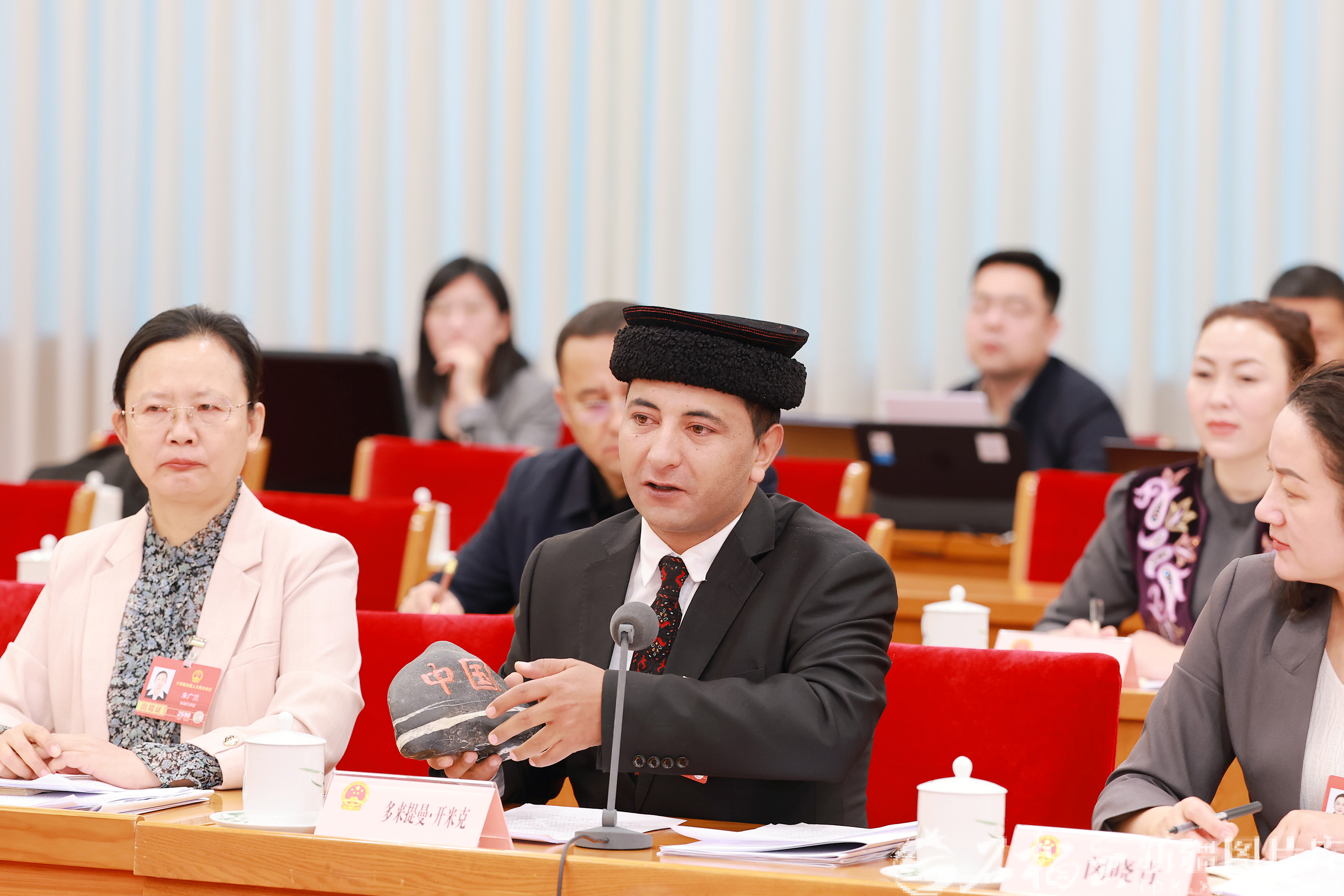 多來提曼·開米克代表在發(fā)言時展示自己從家鄉(xiāng)帶來的“戍邊石”。天山網(wǎng)-新疆日報記者 崔志堅攝