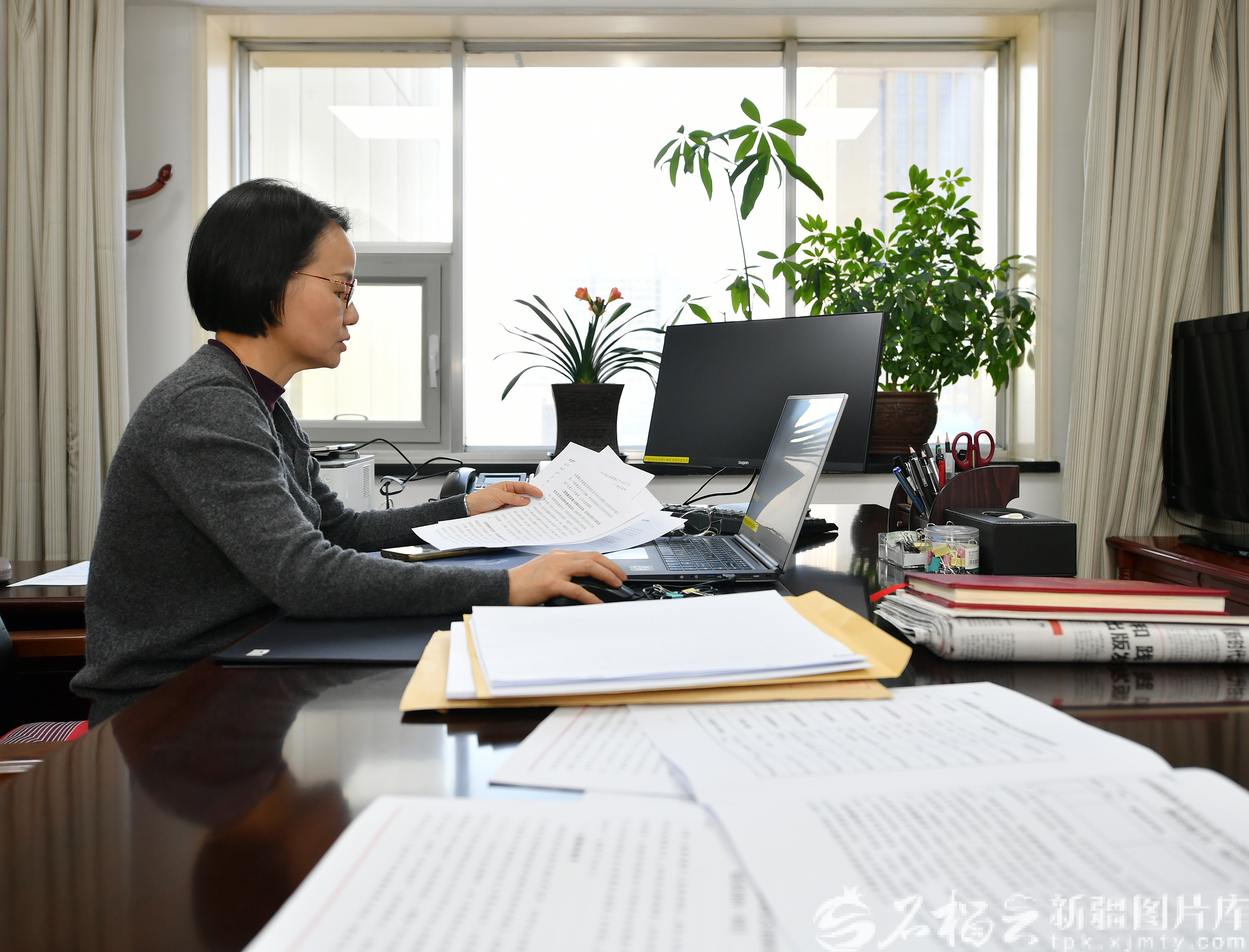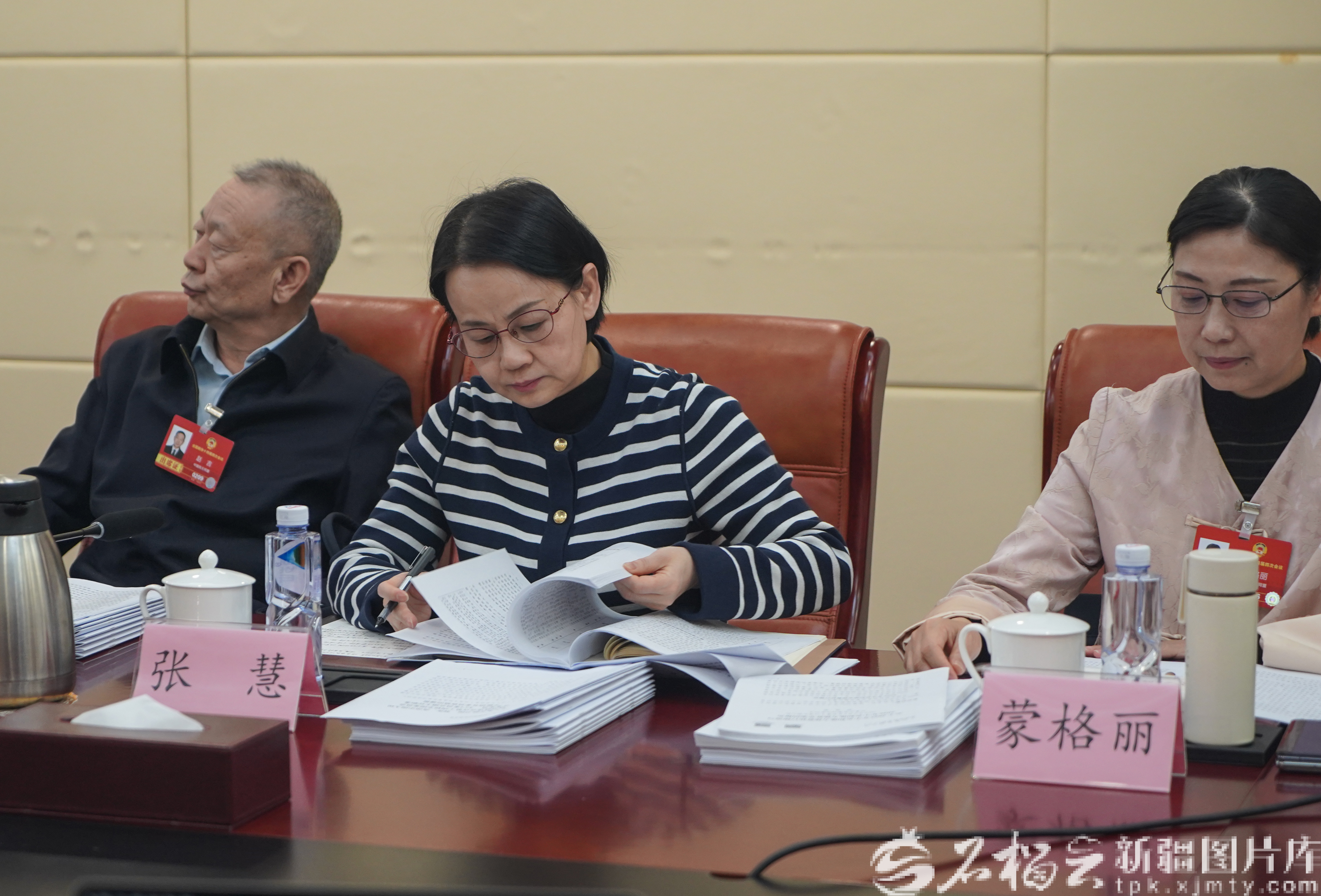 3月7日,出席全國政協(xié)十四屆四次會議的住疆全國政協(xié)委員在各界別小組討論政府工作報告和計劃報告、預算報告。圖為張慧委員(中)在認真研讀相關(guān)材料。